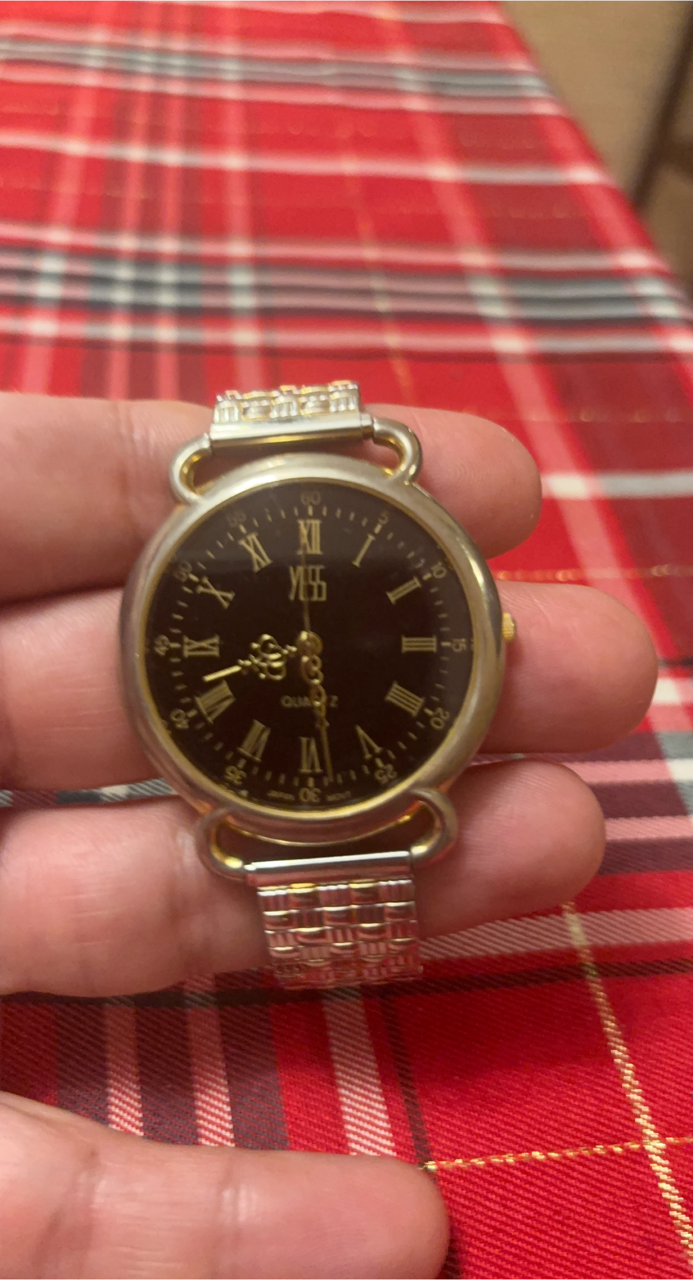 Selling a ladies Quartz watch. It has a black face with Roman numerals and a silver and gold coloured band. It's in great condition and ready for a new home