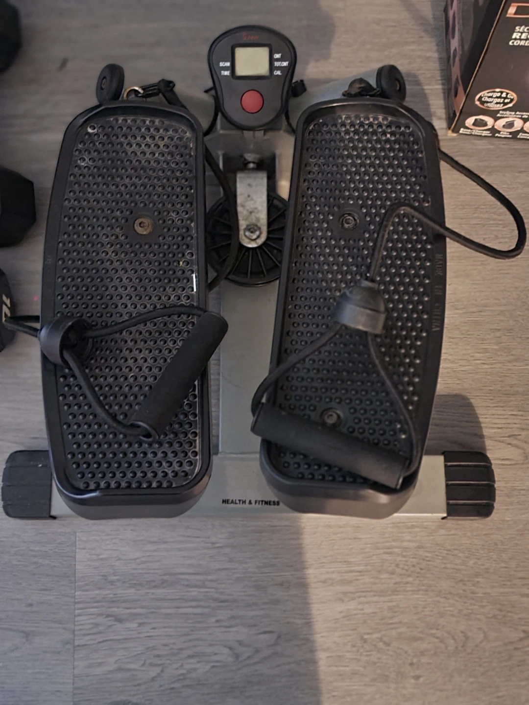 Compact stepper with resistance bands for a full-body workout. It has an LCD display showing scan, time, total count, and calories. Includes built-in resistance bands for upper body engagement.