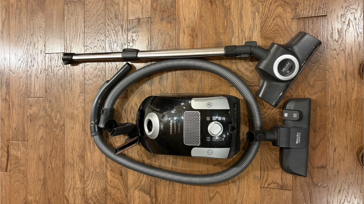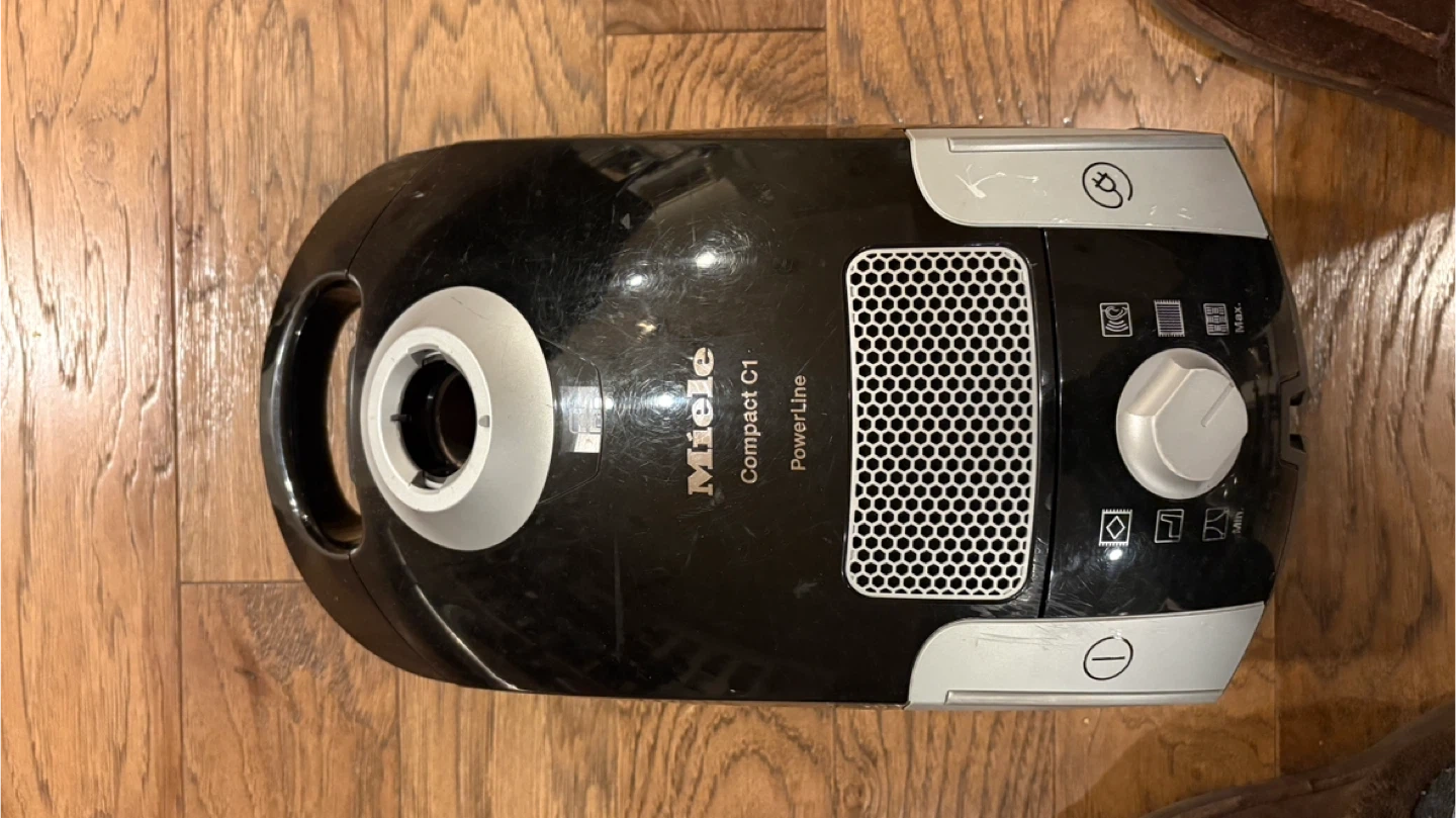 This is a Miele Compact C1 PowerLine vacuum cleaner. It includes the main unit, hose, and various attachments. Excellent for keeping your floors spotless! Great for hard wood floors and low-pile rugs. Excellent condition. Powerful suction and lightweight, this vacuum is perfect for efficient, everyday cleaning in homes, apartments, and offices. Ideal for hard floors and low-pile area rugs. Comes with extra Turboteq powerhead for more efficient vacuuming of rugs. Perfect for those seeking a compact, lightweight, and easy-to-use bagged vacuum.