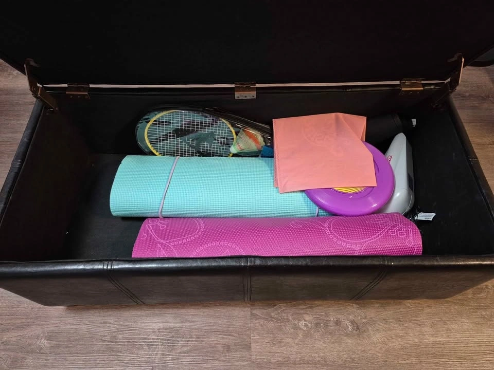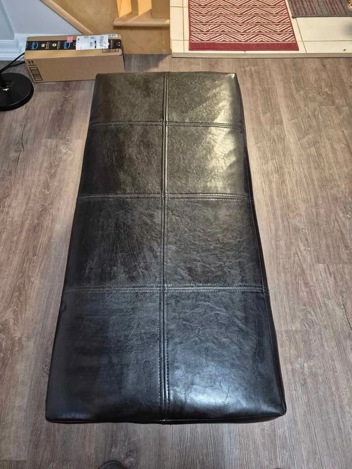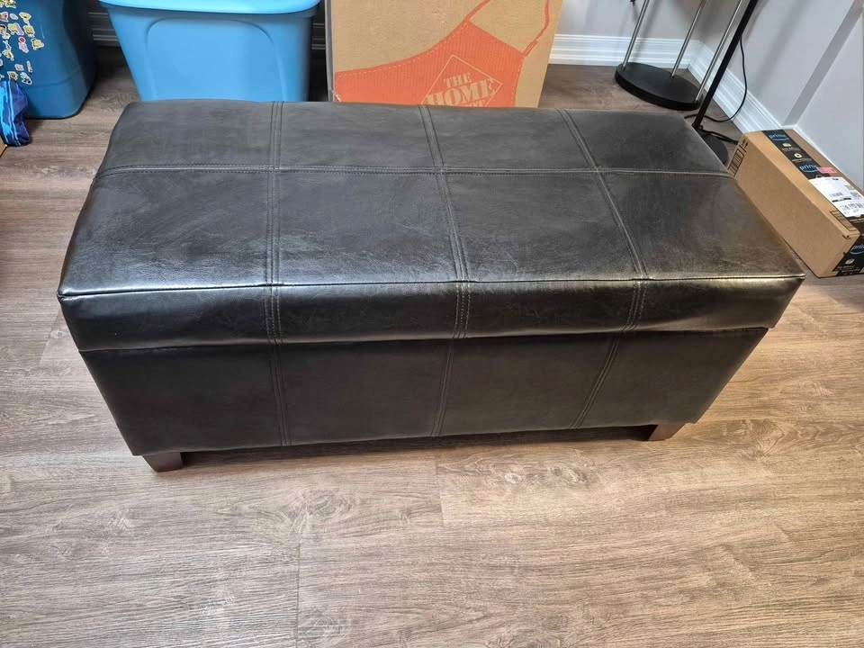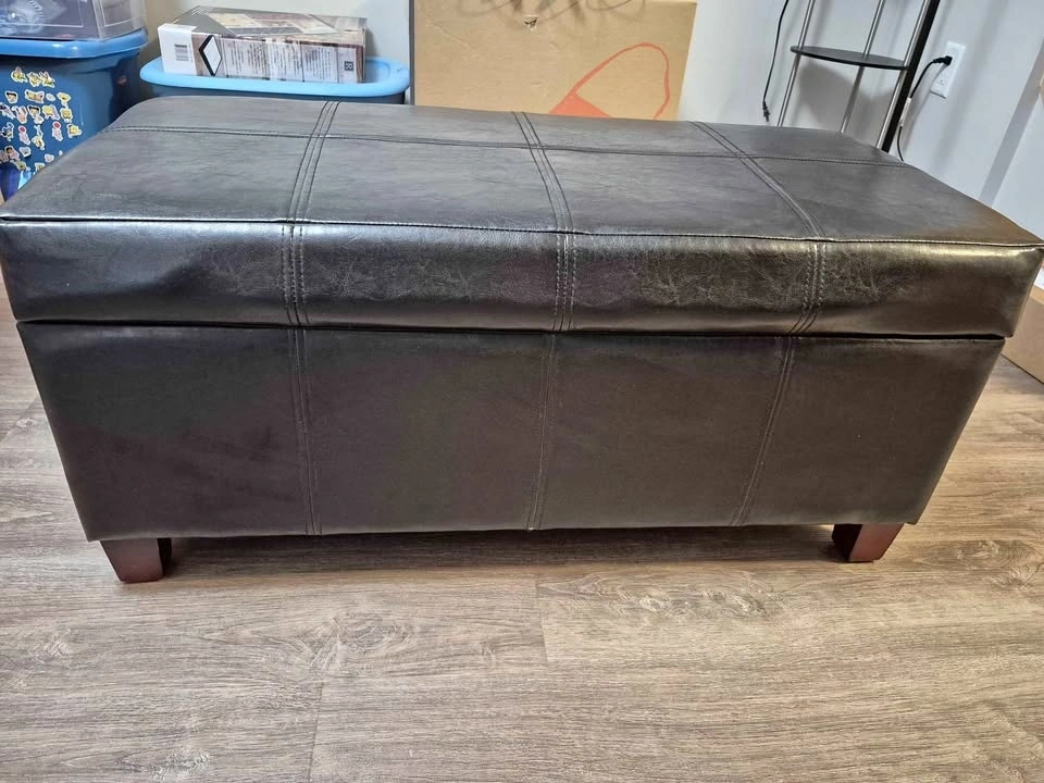 Excellent multi-purpose storage bench in a sleek dark brown faux-leather finish. Features a hinged lid with a deep interior, perfect for organizing blankets, pillows, toys, or sports equipment. The top is padded and sturdy enough to be used as extra seating for guests or as an entryway bench for putting on shoes. Condition: Very clean and well-maintained. No major rips or tears. Features: Easy-open hinged lid (stays open on its own), stylish stitched paneling, and solid wood-finish feet. Material: Durable, easy-to-clean synthetic leather. Dimensions: Length 38 inches, Width 18 inches, Height 18 inches. Location: Milton (near Scott/Derry).