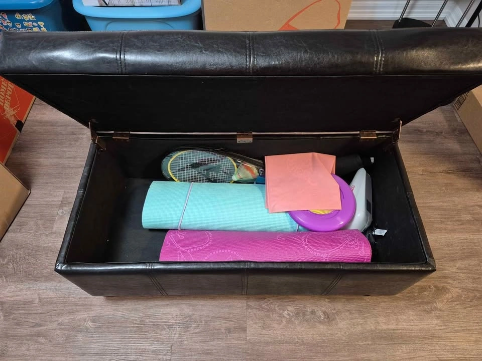 Excellent multi-purpose storage bench in a sleek dark brown faux-leather finish. Features a hinged lid with a deep interior, perfect for organizing blankets, pillows, toys, or sports equipment. The top is padded and sturdy enough to be used as extra seating for guests or as an entryway bench for putting on shoes. Condition: Very clean and well-maintained. No major rips or tears. Features: Easy-open hinged lid (stays open on its own), stylish stitched paneling, and solid wood-finish feet. Material: Durable, easy-to-clean synthetic leather. Dimensions: Length 38 inches, Width 18 inches, Height 18 inches. Location: Milton (near Scott/Derry).