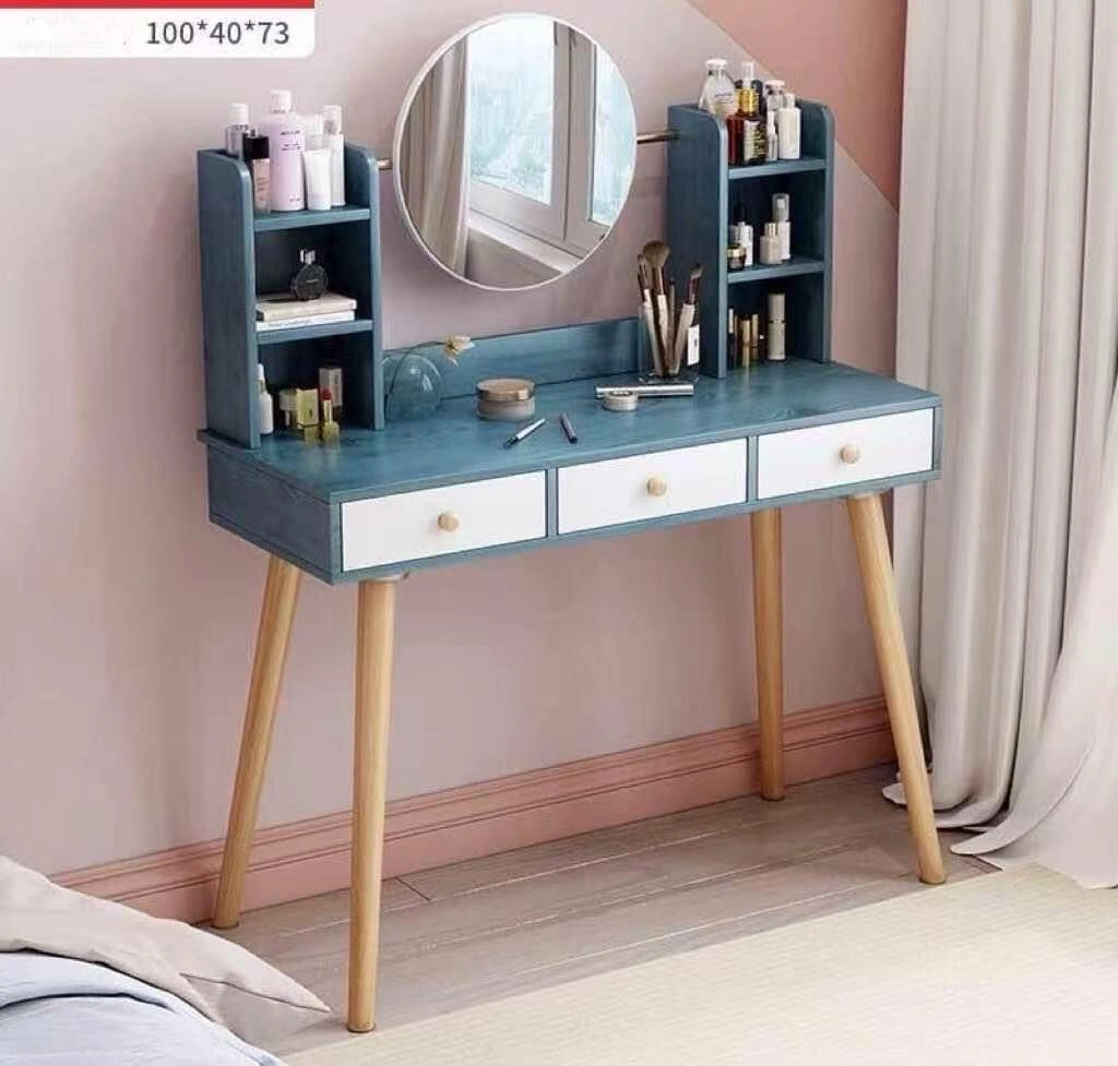 Cute vanity set. Features a round mirror, three drawers, and two side organizers. Light blue and white colour scheme. Wooden legs.