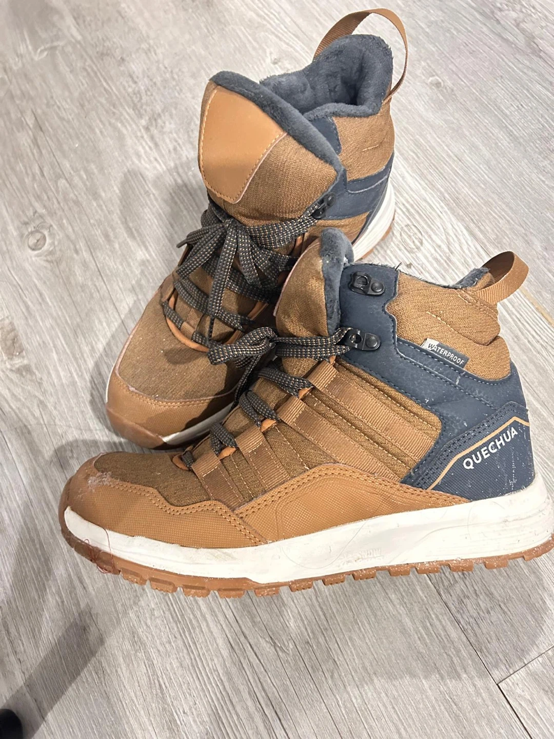 Selling a pair of Quechua waterproof winter boots in brown! They're perfect for keeping your feet warm and dry during the colder months. They have some signs of wear, but still have lots of life left in them!