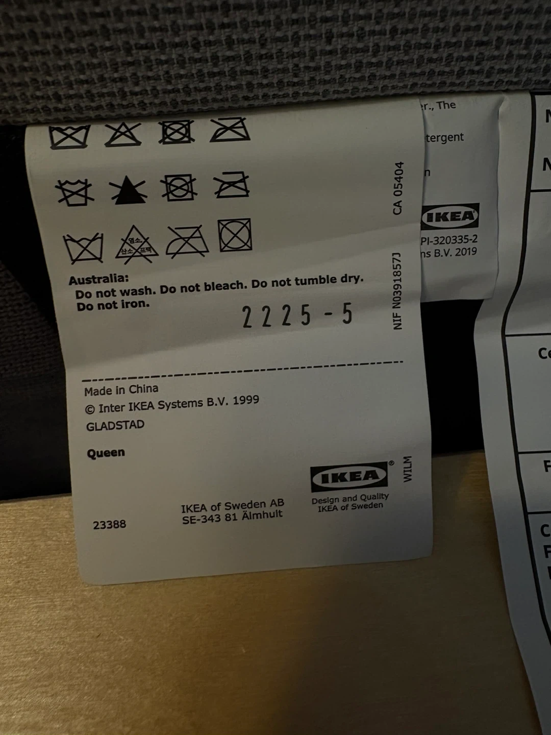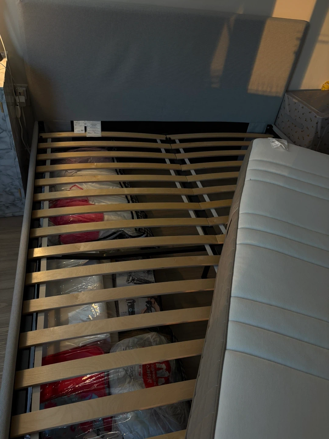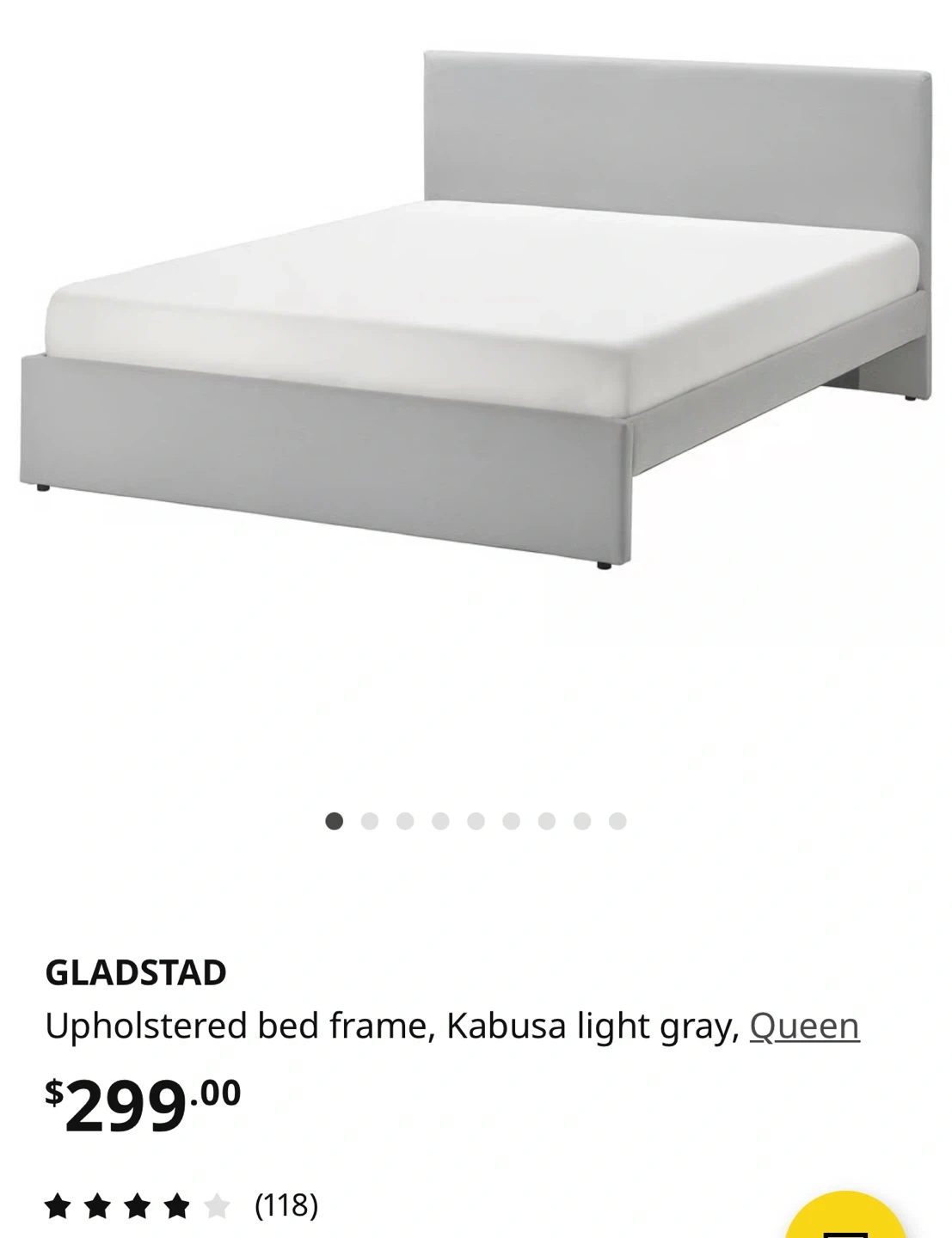 Selling an IKEA Gladstad upholstered bed frame in light gray, queen size. The bed frame is in good condition and ready for a new home. The original price was $299.00. A great deal for a stylish and comfortable bed!