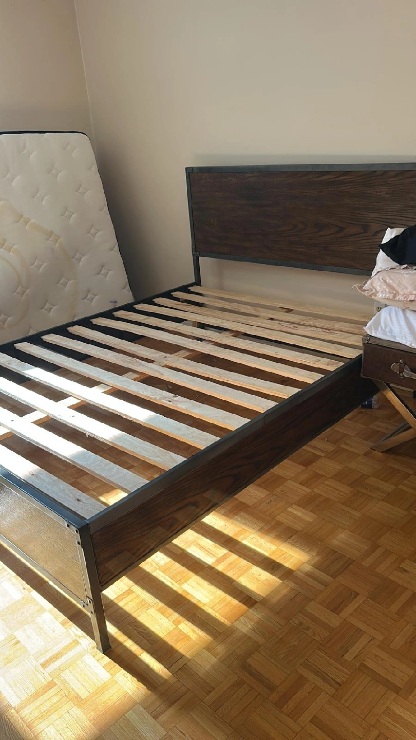 Selling a wood and metal furniture set. Includes a console table, a side table, and a bed frame. Great for adding a rustic touch to your home!