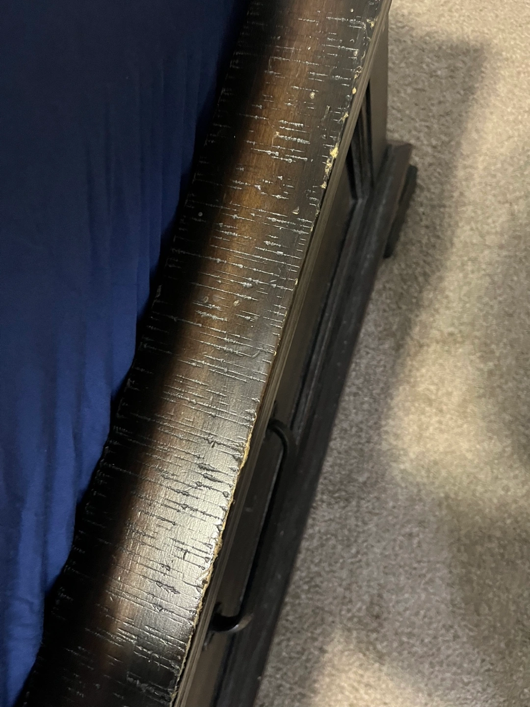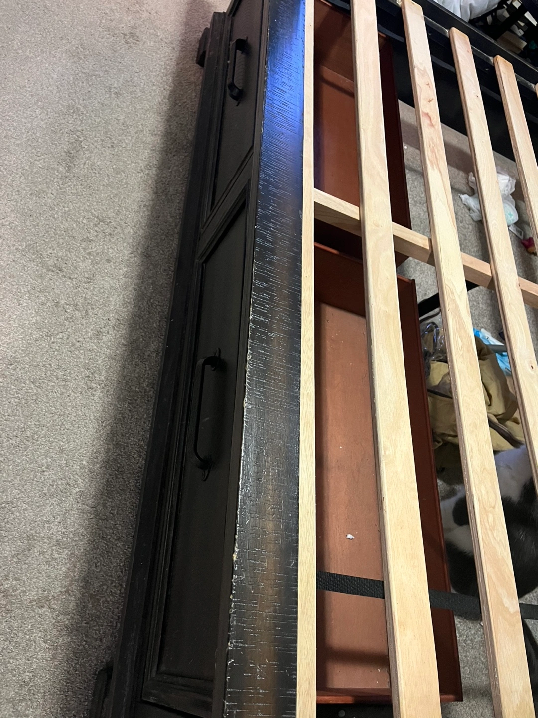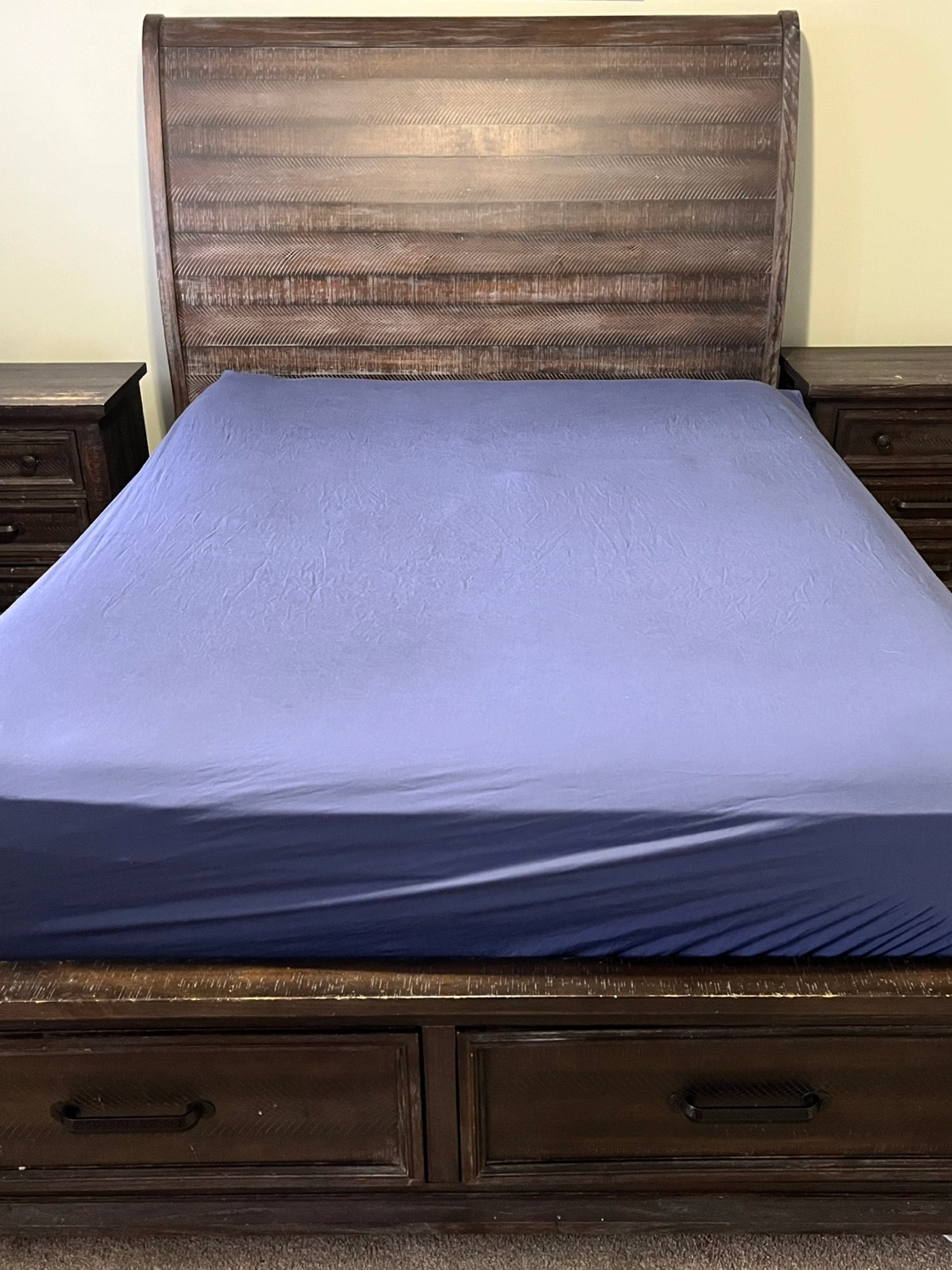 Wood Queen Bed Frame. Purchased from Leon’s about 6 years ago. In good shape, there’s a few minor knicks on the foot board that could be easily filled with a furniture pen! **note the bed is about 96” long, plus the space needed to open the drawers! Pickup in Binbrook! The headboard is long, will definitely need a pickup truck at least to move!