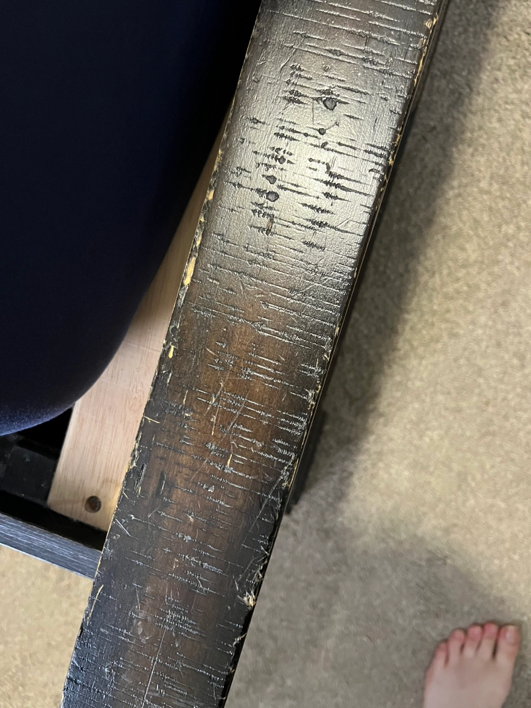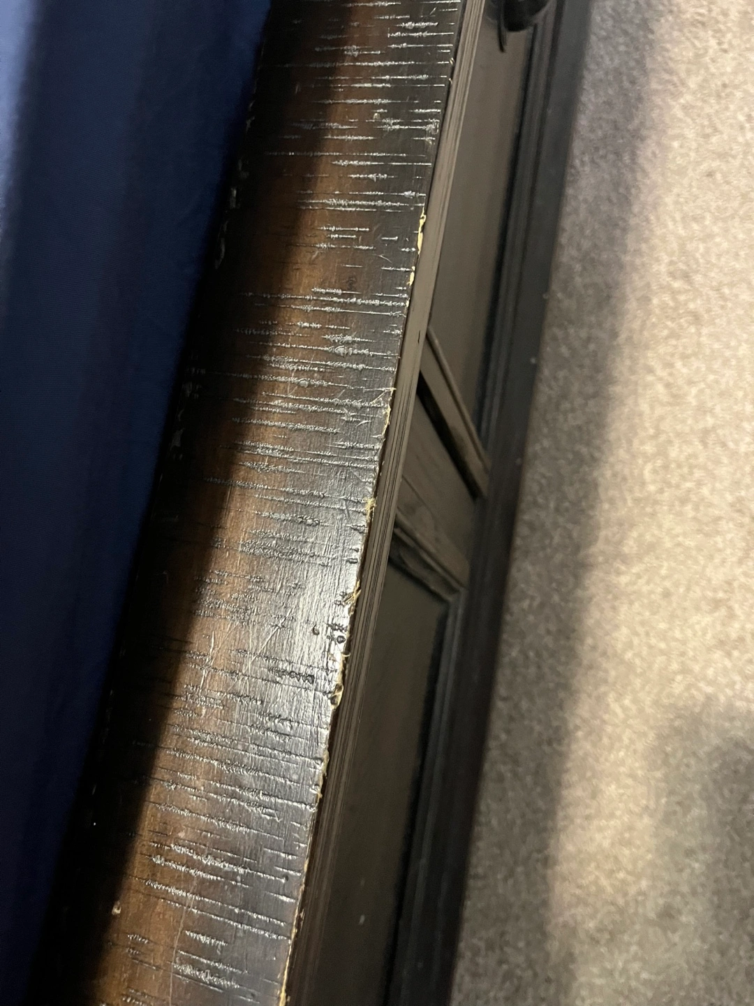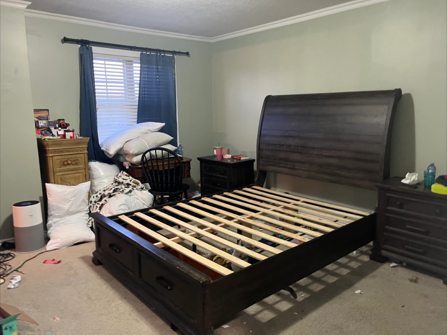 Wood Queen Bed Frame. Purchased from Leon’s about 6 years ago. In good shape, there’s a few minor knicks on the foot board that could be easily filled with a furniture pen! **note the bed is about 96” long, plus the space needed to open the drawers! Pickup in Binbrook! The headboard is long, will definitely need a pickup truck at least to move!