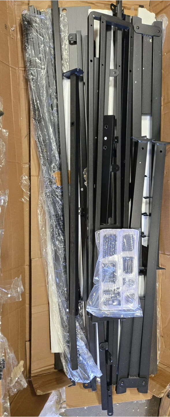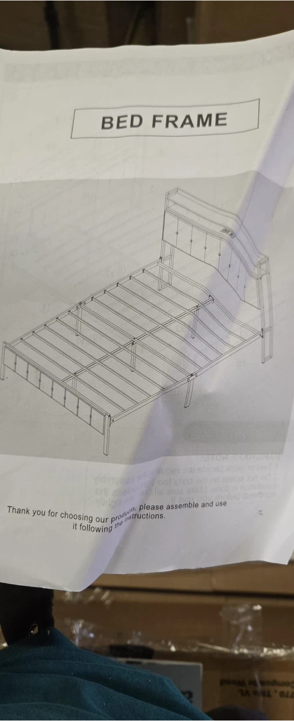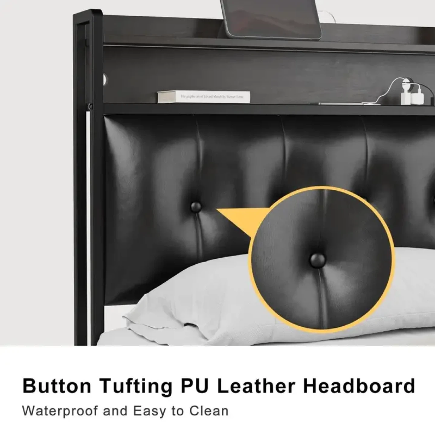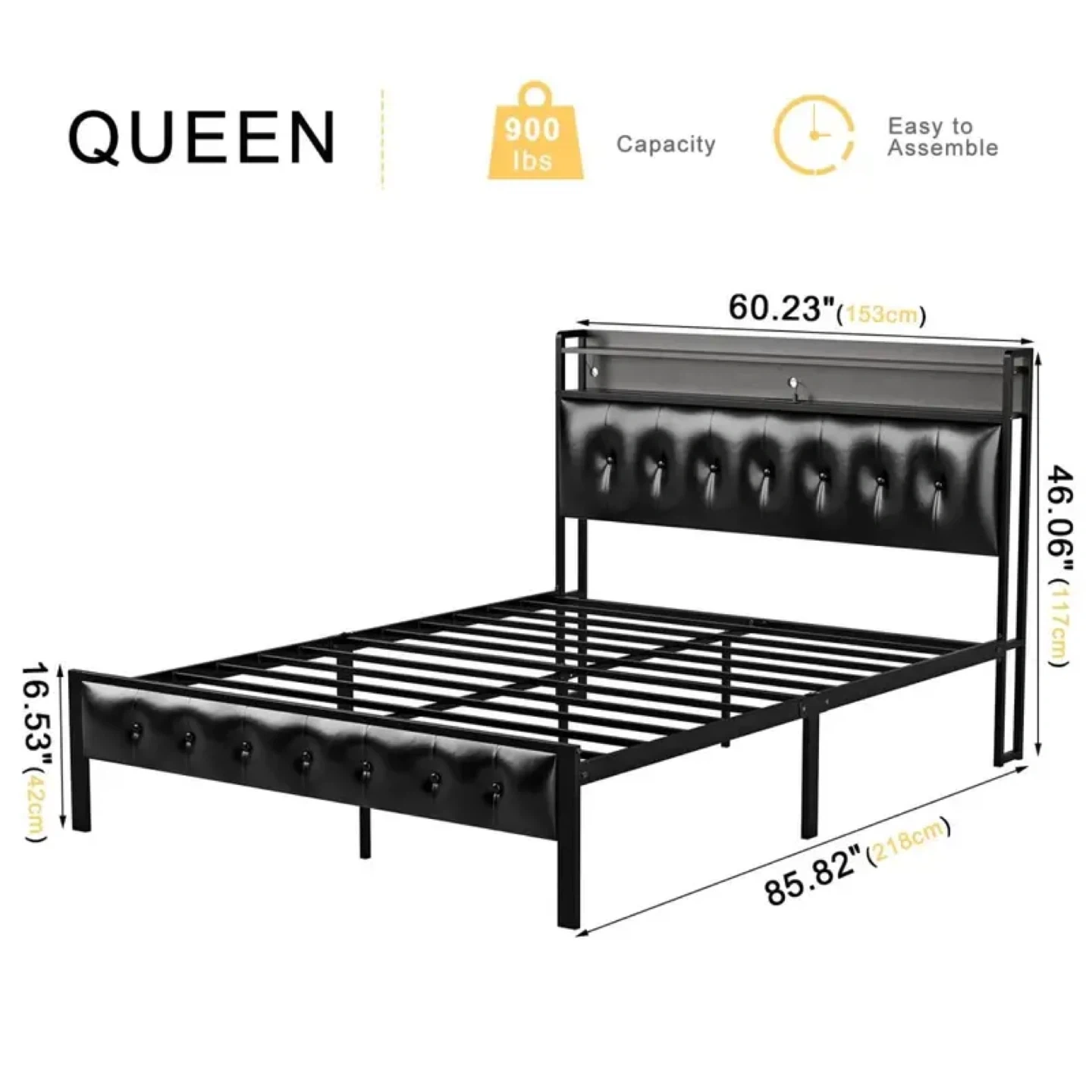 OPEN BOX NEW NEVER ASSEMBLED, MISSING POWER OUTLET AND LED STRIP Size Queen Material MDF Product Dimensions 2.18L x 1.53W x 1.17H Meters Style Modern Special feature Fade Resistant Colour Black User-friendly Design: 2 AC outlets and 2 USB power strips built into the headboard allow you to charge your phone and Pad. With a remote controller, you also could select 20 Static Colors and 22 Dynamic Modes for memorizing the colors that you prefer PU Leather headboard & Footboard: The headboard & Footboard is Combined with the Black PU Leather and the iron frame. The soft footboard and the curved corner protect your family from sharp collisions and prevent your mattress from being slipped Industrial Style: The bed frame is combined with the MDF board wood grain, black PU leather headboard, and footboard. The stylish hollow design headboard looks simple and beautiful. Very suitable for your house style Quick & Easy Assembly: The bed frame comes with detailed instructions, assembly tool, and numbered parts, assembly can be done within 1h.Plastic foot pads protect your floor from scratches. No box spring needed Strong Support: This bed frame has 13 heavy-duty metal slats anchored at the side so nothing will shake or shift. 9 sturdy legs can better distribute weight and protect your mattress from sagging. It’s firmness with bearing capacity of 800lbs