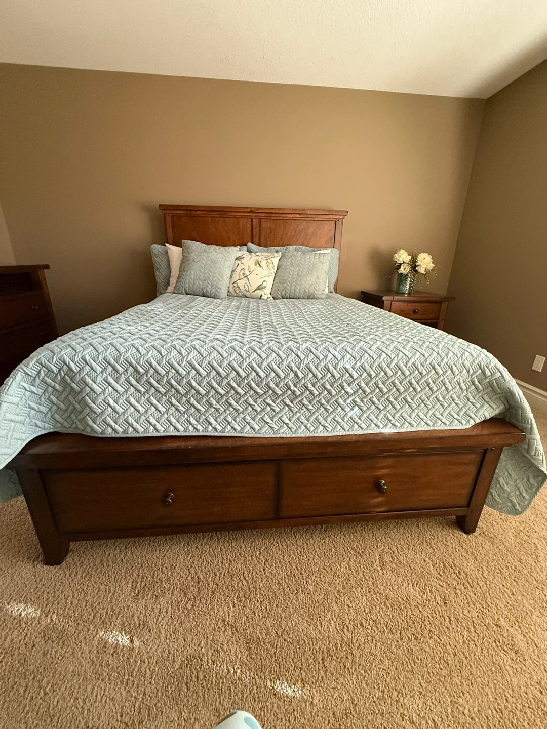 10Selling queen bedroom set that includes a bed frame, nightstand, and dresser. All pieces are made of wood and in good condition. Perfect for furnishing a bedroom!