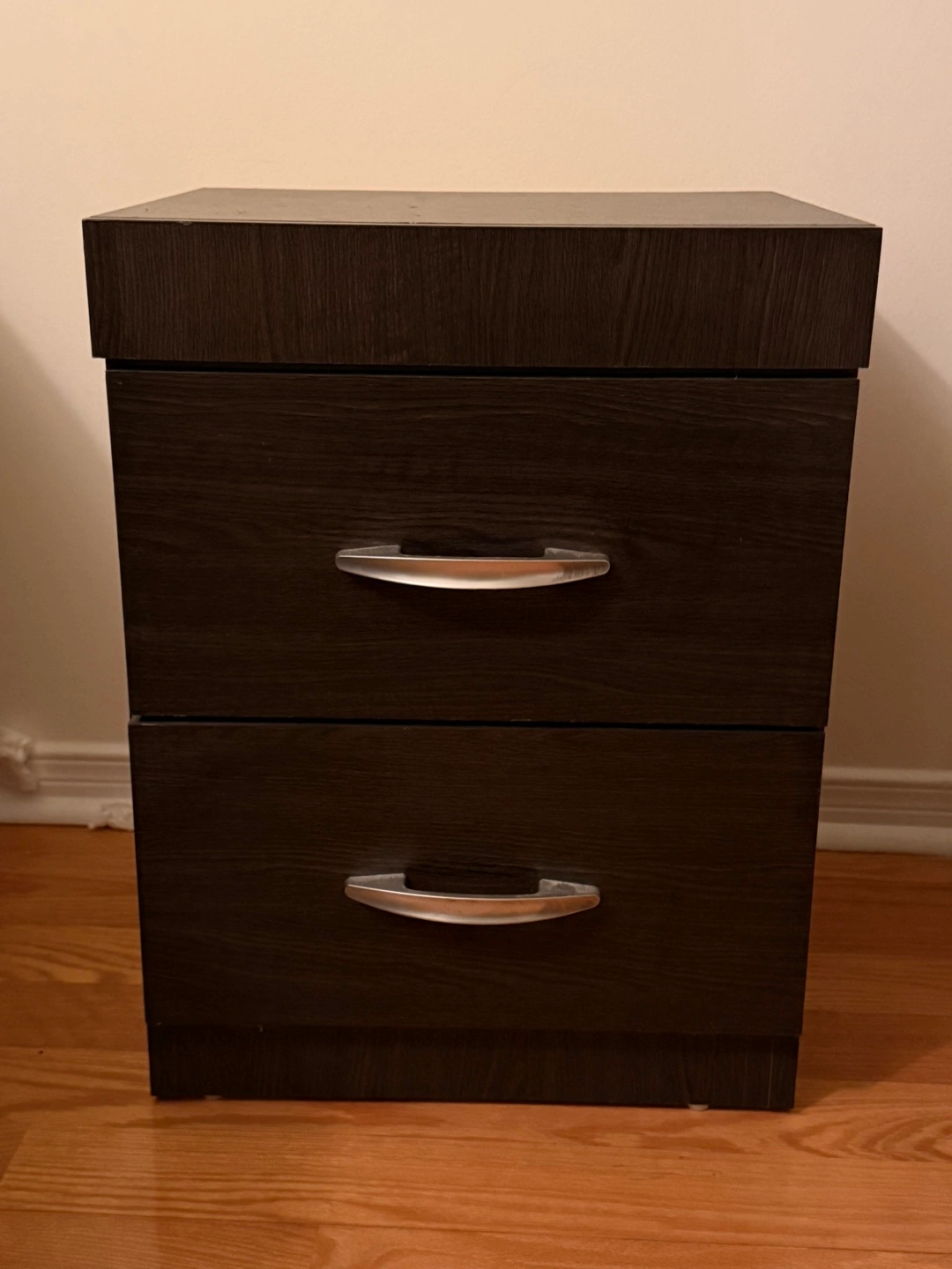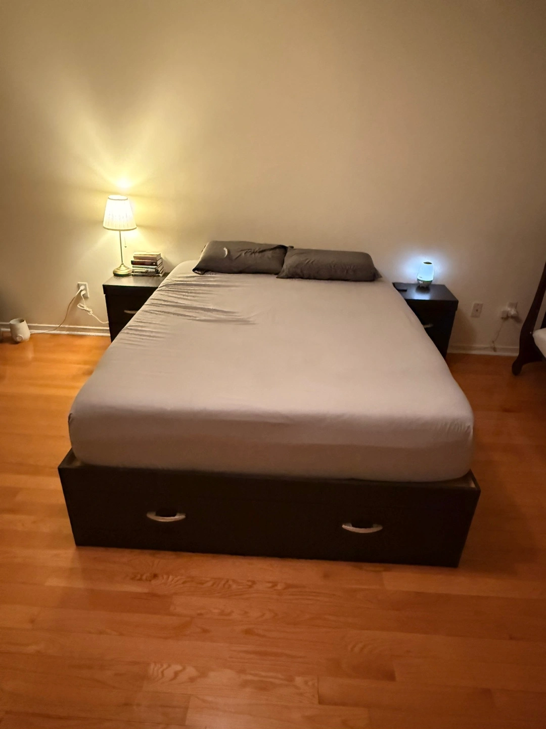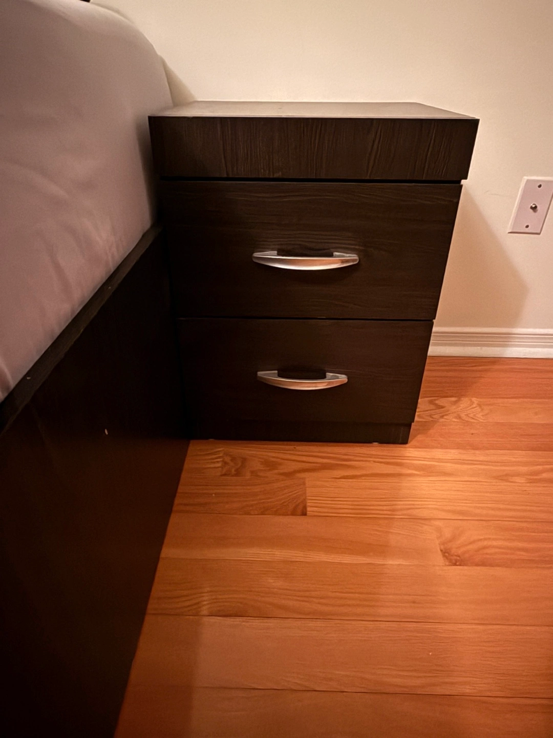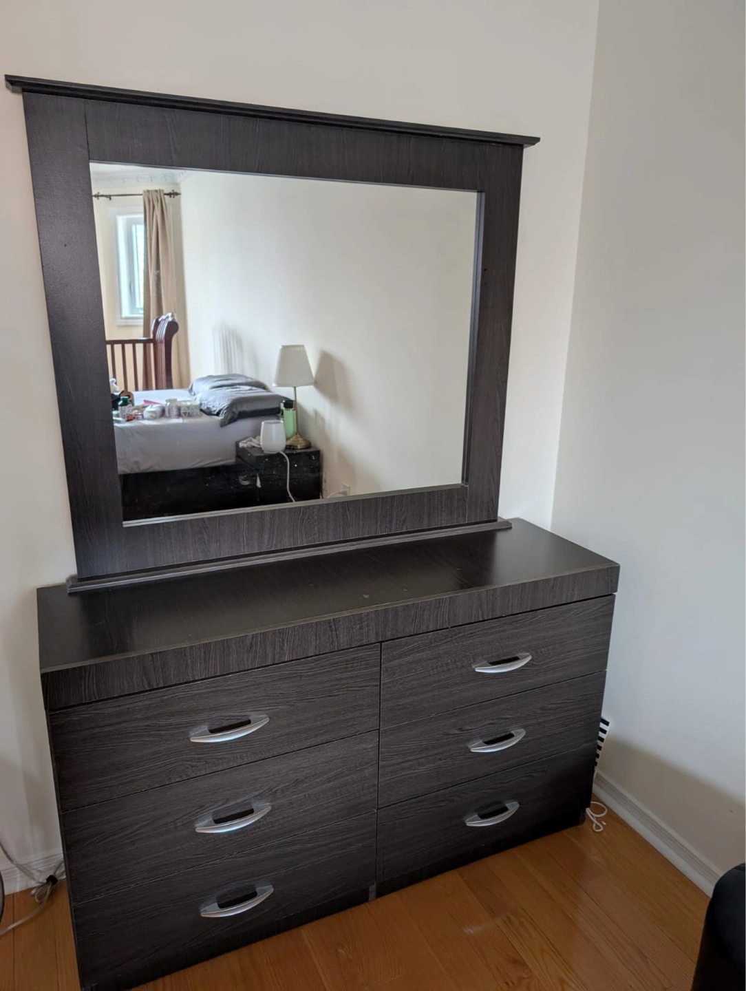 14Dark brown queen size bedroom furniture set. Includes queen-size bed frame with storage drawers, two matching two-drawer nightstands, and a six-drawer dresser with a mirror. Great for small spaces.