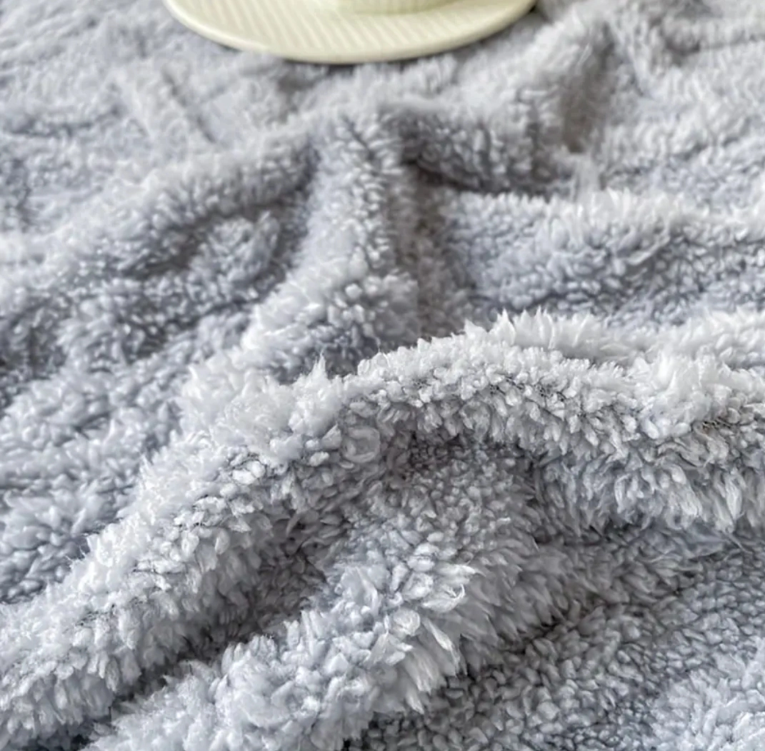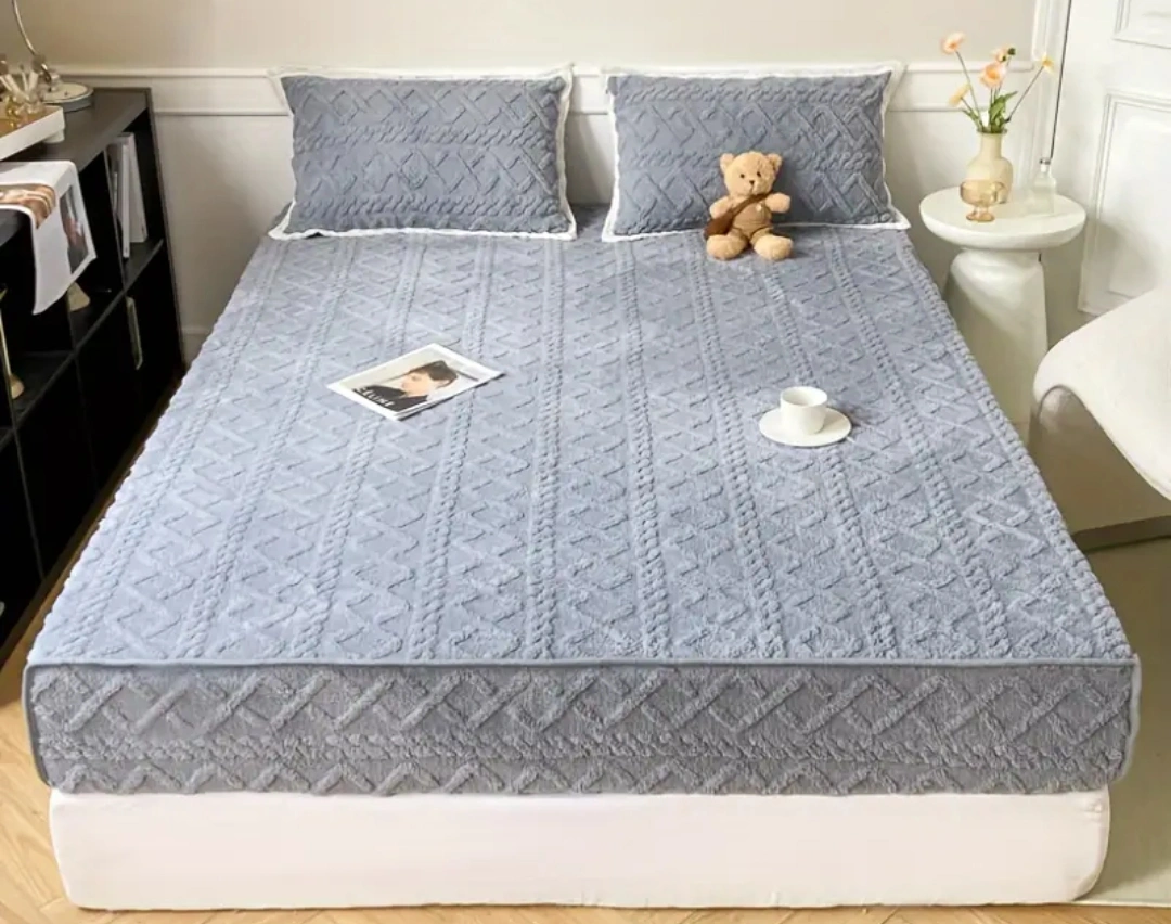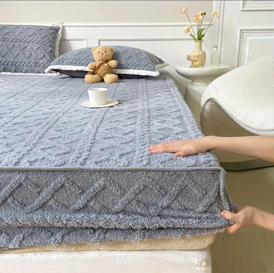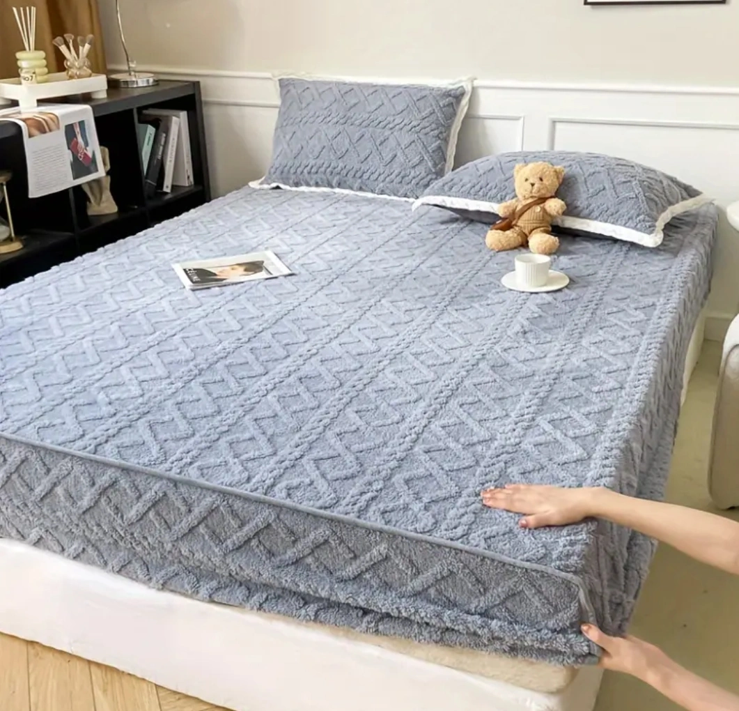 Brand New Queen Soft grey fleece Fitted Sheet. Features a knitted pattern. No pillowcases. Adds warmth and comfort to your bed.