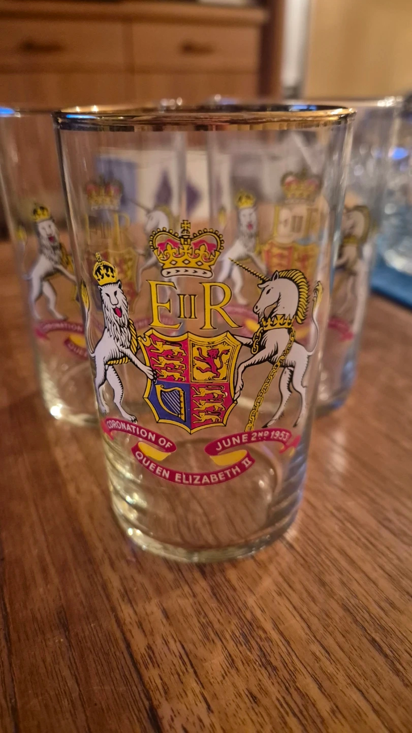 55Selling a set of 3 glasses commemorating the coronation of Queen Elizabeth II in June 1953. They feature the royal coat of arms with a lion and unicorn design. Perfect for collectors or anyone interested in royal memorabilia. Good condition. Gold rim is faded on some.