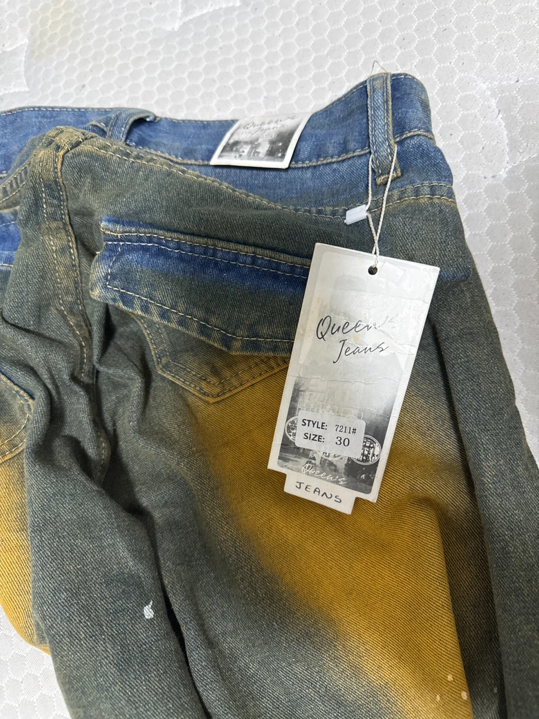 16Selling a pair of distressed denim pants from Queen Jeans. These are a size 30 and feature a unique, worn look with distressed detailing and yellow accents. They're perfect for adding a bit of edge to your wardrobe!