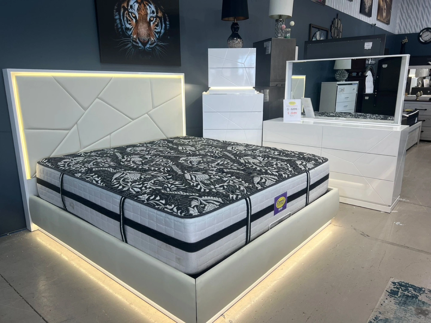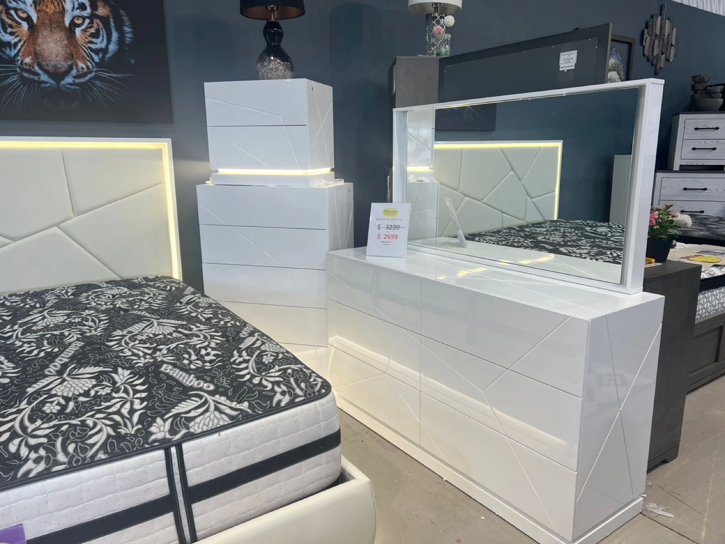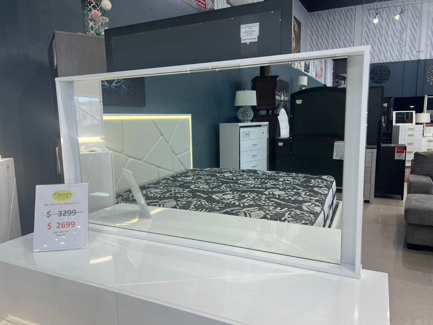 White bedroom set with a Queen size bed, dresser, mirror, and two nightstands.