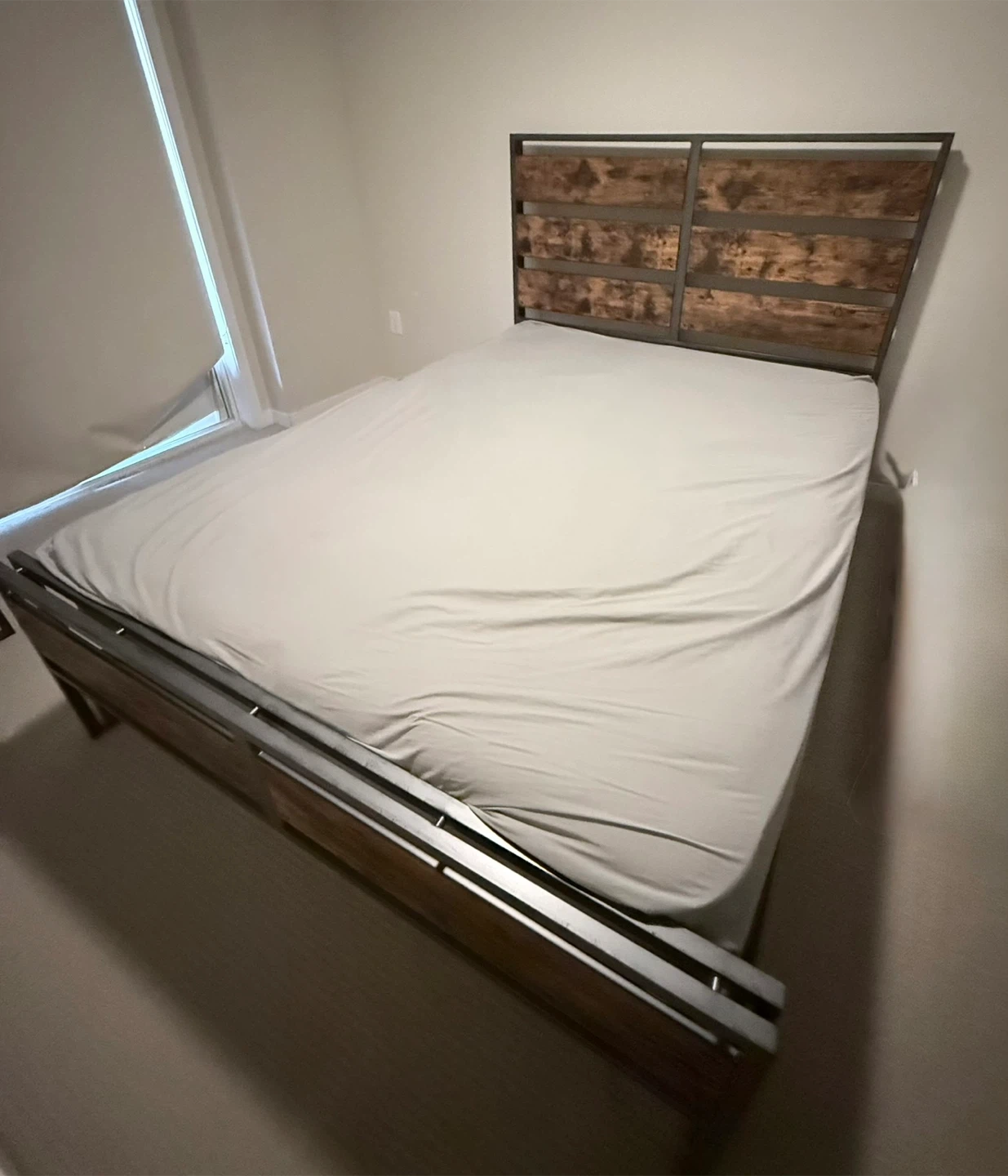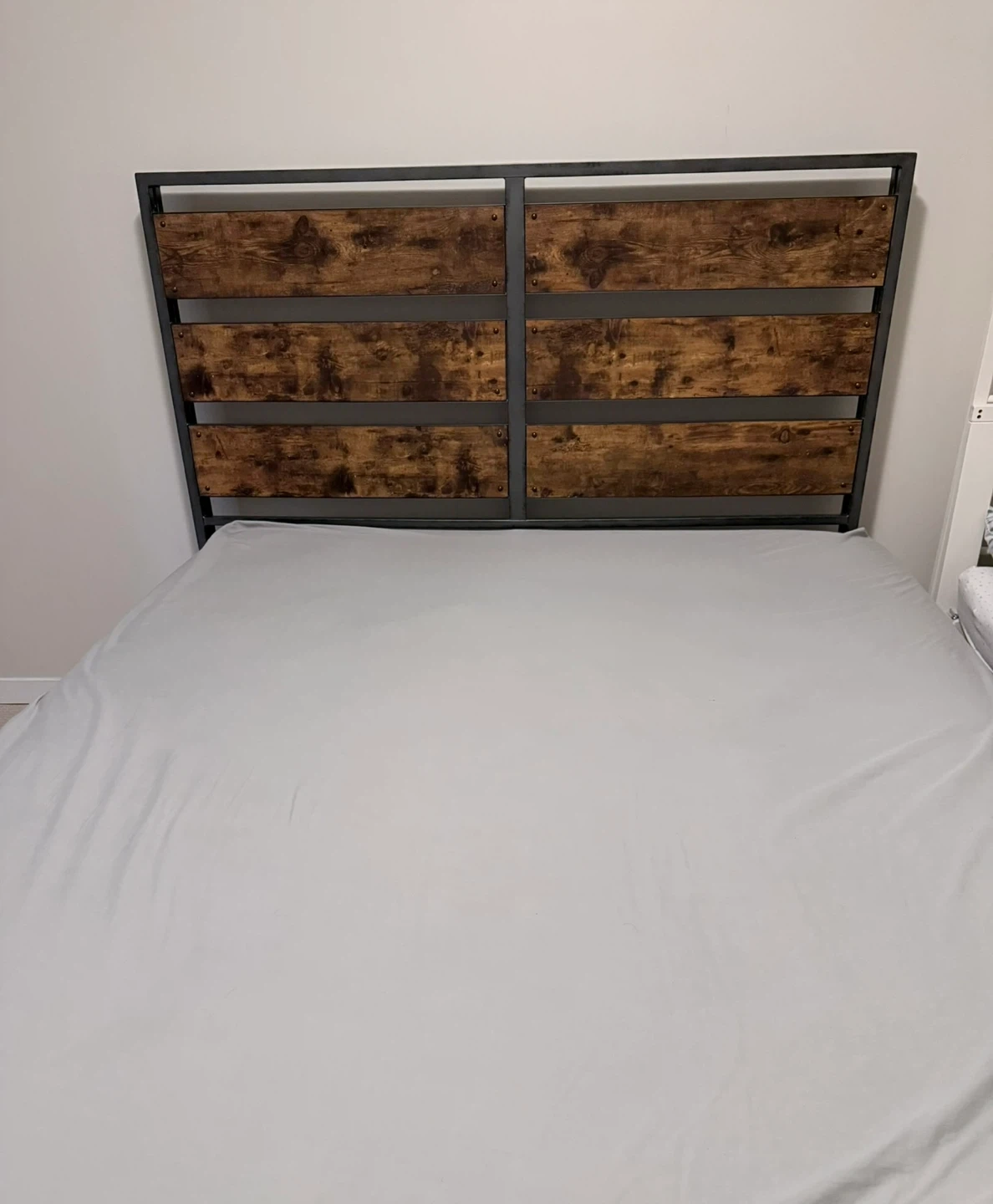 Selling a queen size bed frame with a wood and metal headboard. It's in great shape and ready for a new home. The frame is sturdy and stylish, adding a touch of rustic charm to any bedroom comes with box spring.