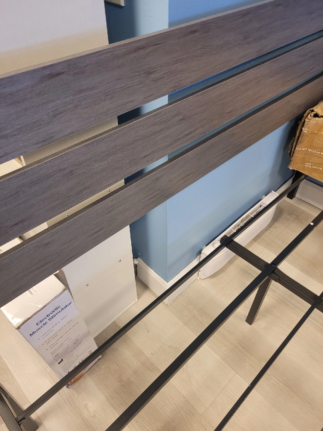 98Selling a new queen size bed frame with a grey wooden headboard. It's a sturdy frame and the headboard adds a nice touch. The frame is black metal and the headboard has a wood grain finish. Size: 82" Long, 61" Wide * Pick up in store at 258 Main Street South, Newmarket (by appointment only to guarantee we are open). *** Payable by cash, debit or credit ***
