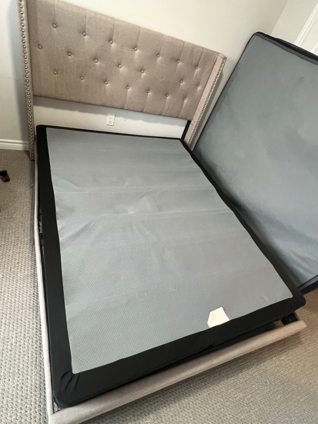 5Hardly used, from a pet-free and smoke-free home. Bought 8 months ago for $1100+tax — selling at $520 due to moving. ✨ Includes: 1. Springwall Comfort Pocket mattress (from The Brick) 2. Upholstered queen bed frame with tufted headboard & nailhead trim 3. Mattress box for added support 🩶 Neutral beige tone fits any décor 💤 Clean, comfortable, and ready to use!