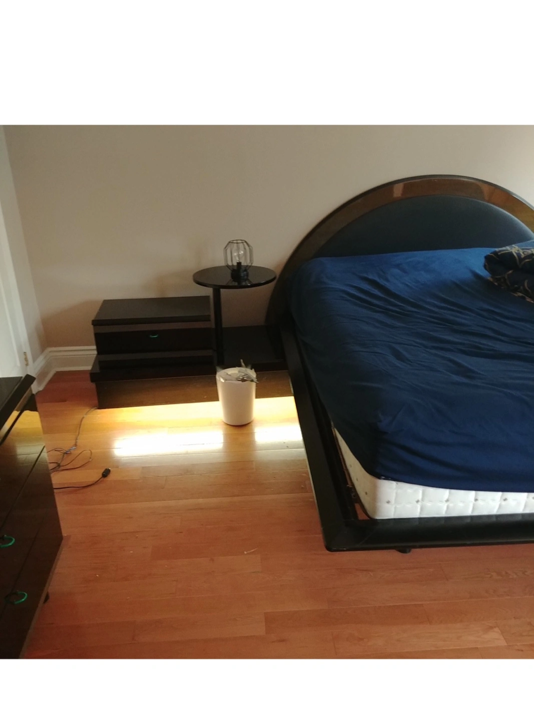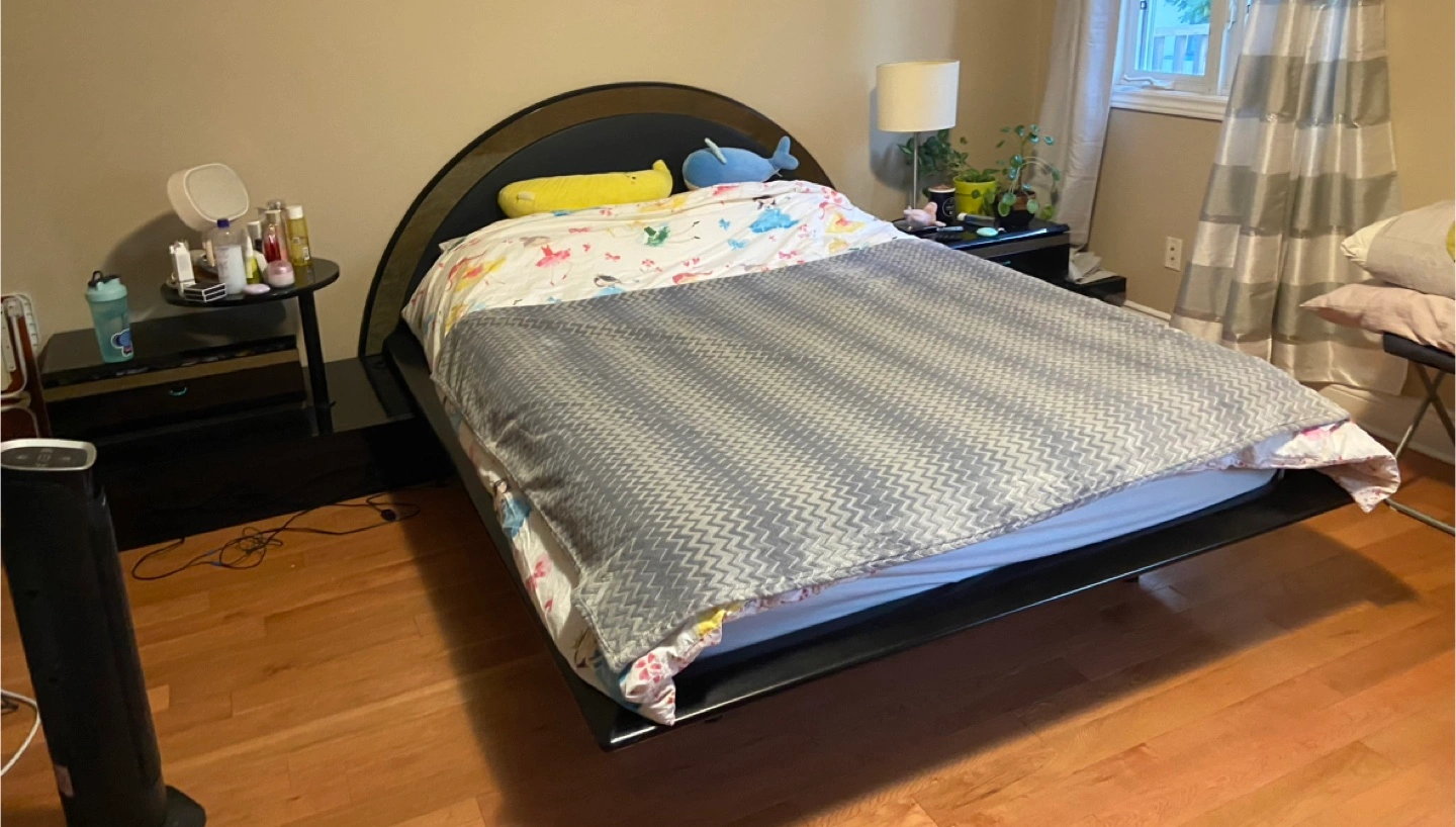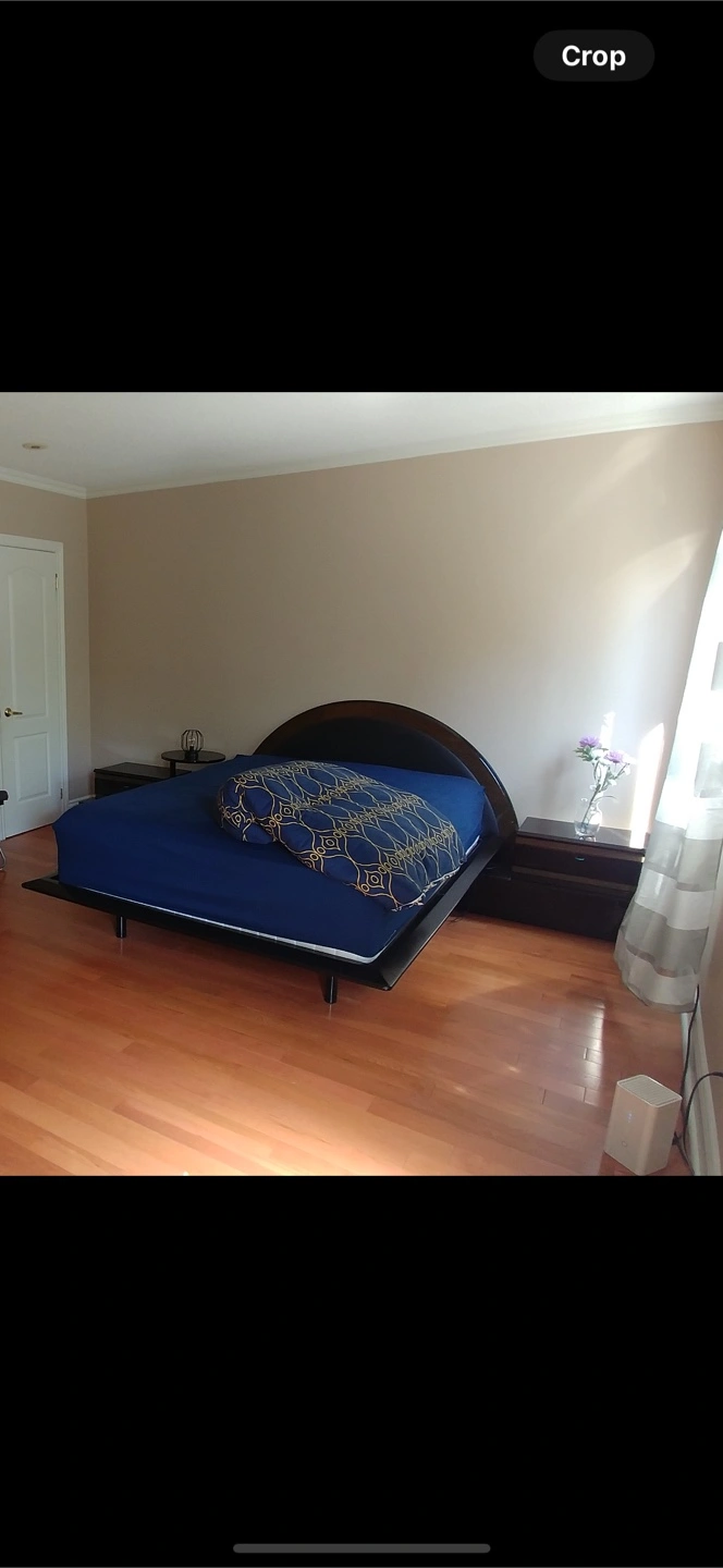Selling a queen size bed frame. It's in good condition and ready for a new home. The frame appears to be made of wood and metal, with a black finish. heavy duty- Solid metal queen bed frame with a ebuilt in headboard - and stand underneath (have lighting built in as well) - mattress is NOT included. Sell because of moving! Nice polished finish and heavy duty. I also has two drawers functioning as nightstands and an additional aide table. Pick up only, close to Yong and Lawrence. Please bring 2-3 friends since you will need the help. Measurements are below, as post is on, means it is still available. Head board stand width: 340cm Bed frame length: 220cm Frame Width: 172 cm Frame height: 30cm