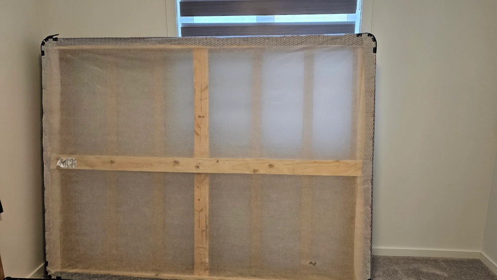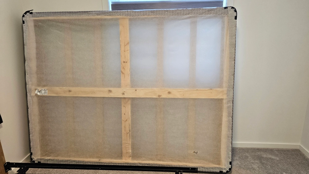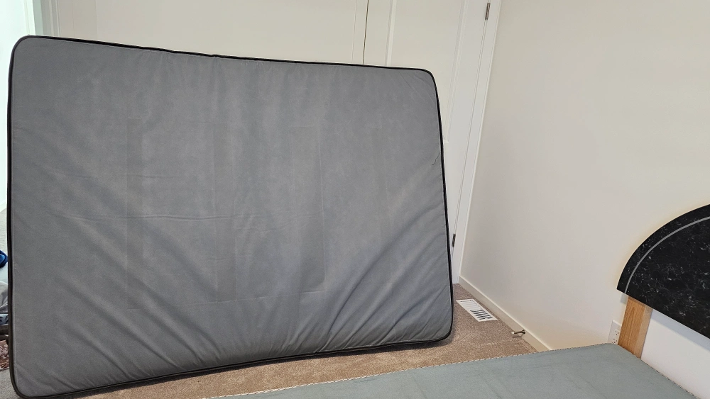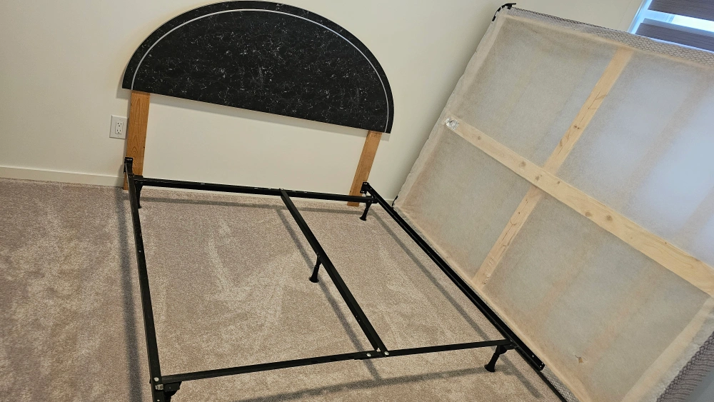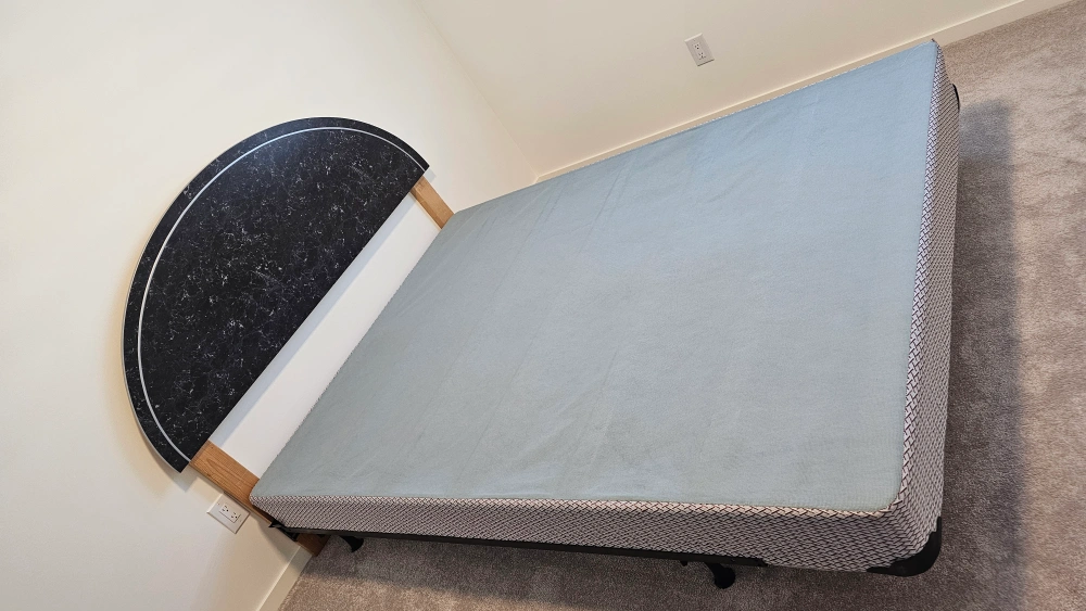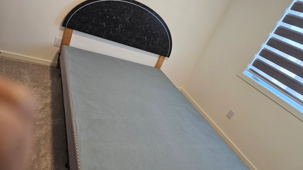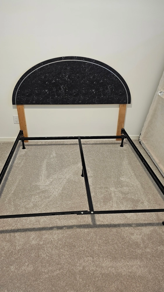 Selling a queen size bed frame with a unique headboard. The headboard features a stylish black and white marble-like design. The bed frame itself is sturdy and in good condition. Perfect for adding a touch of modern elegance to your bedroom! the queen size mattress free of cost
