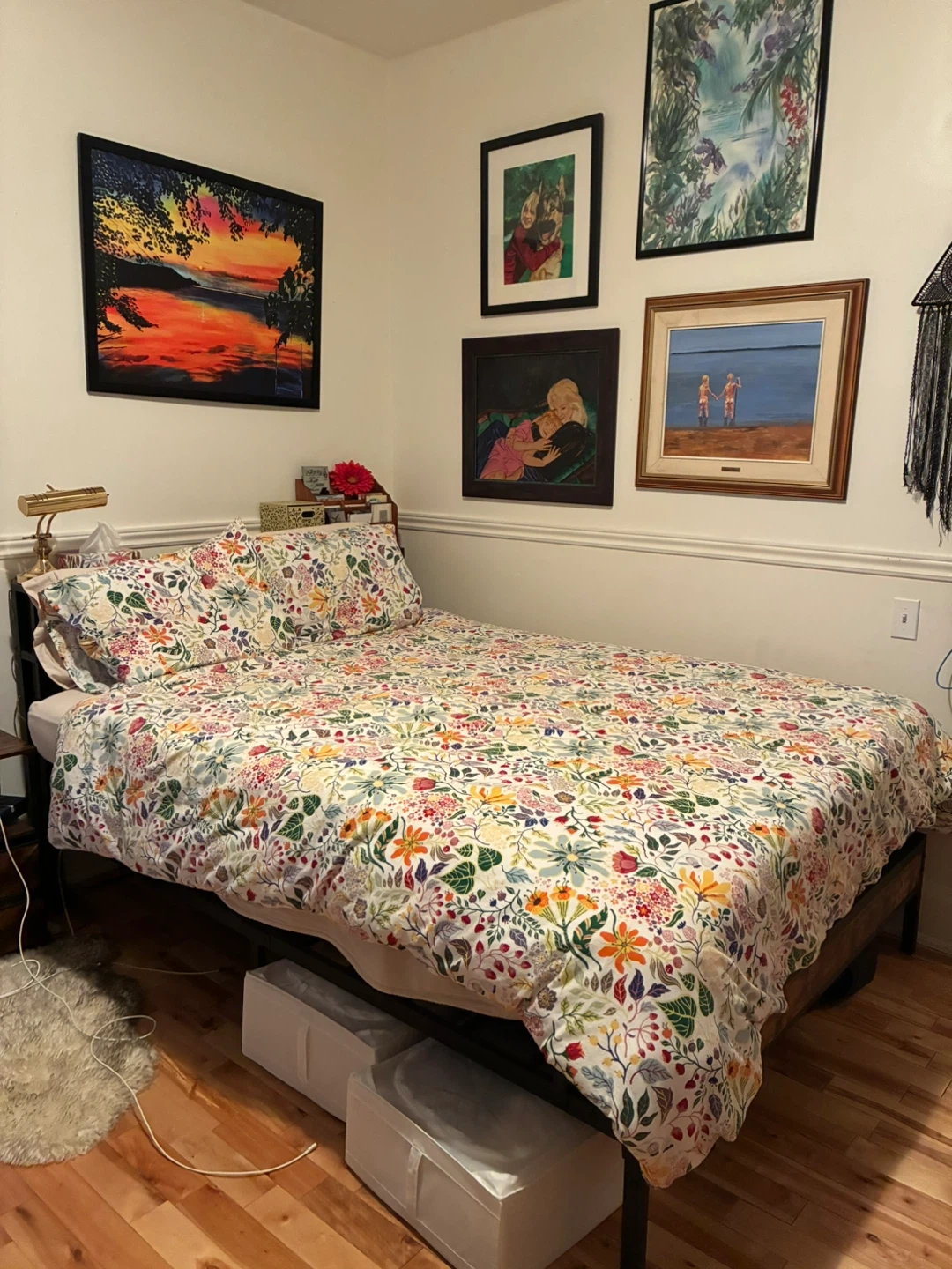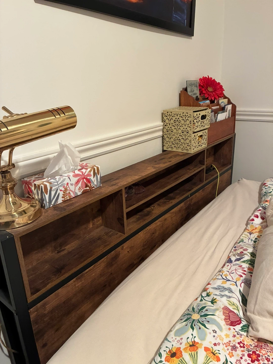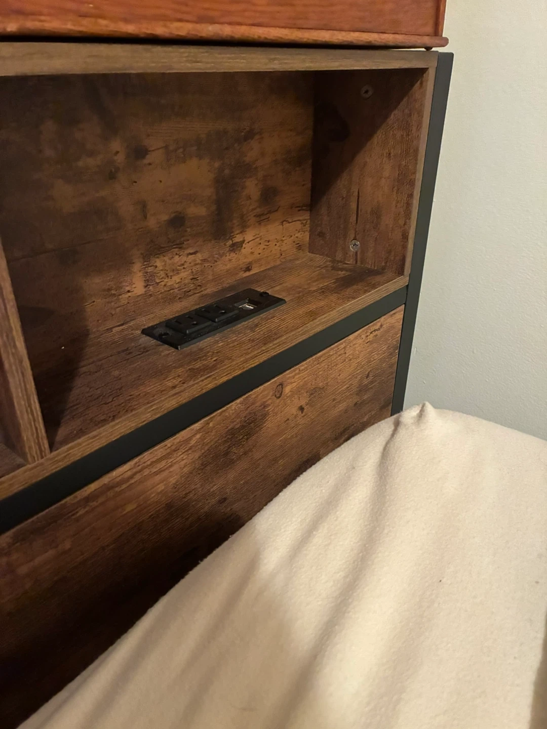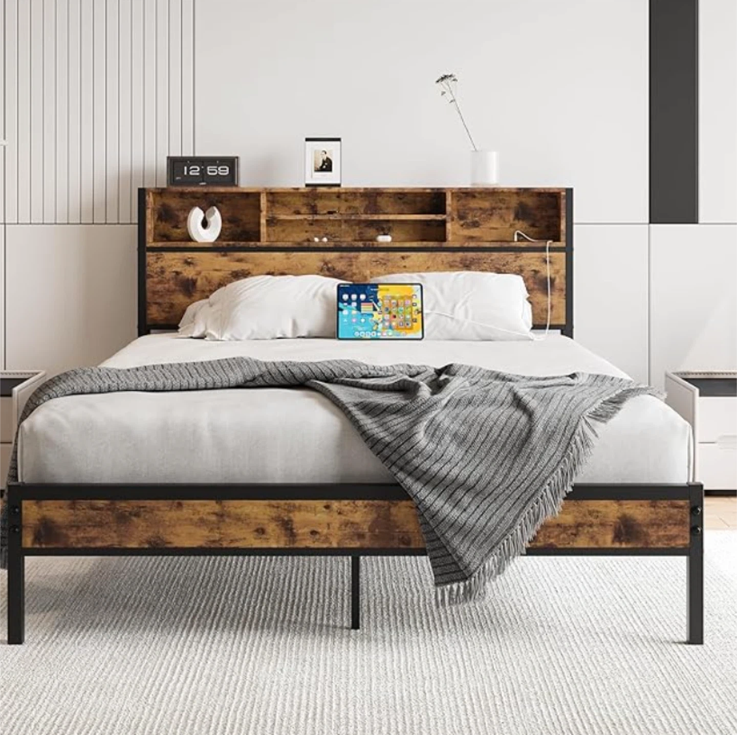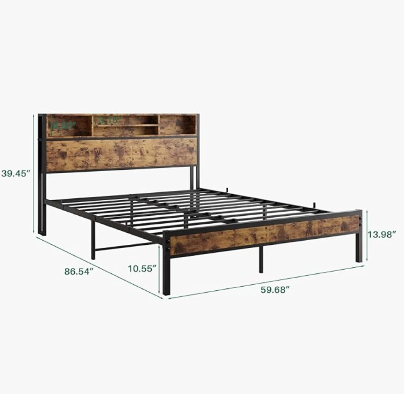 65I'm selling a queen size Crocofair bed frame with a stylish headboard that includes built-in storage shelves! The frame features a rustic brown finish with black metal accents. It's in great condition and ready for a new home. Dimensions are approximately 86.54" x 59.68".