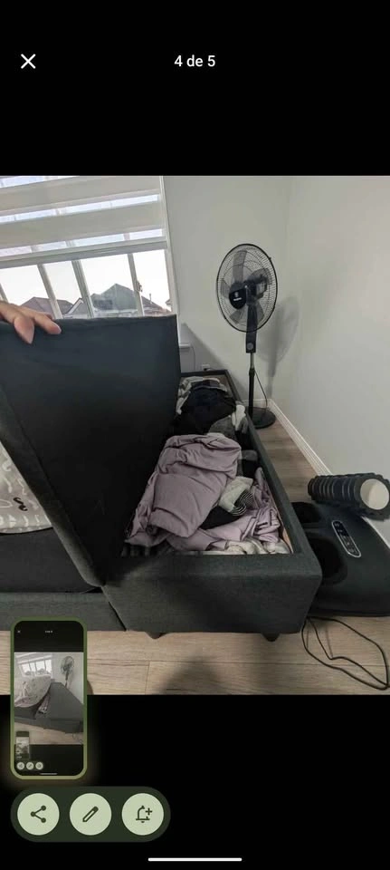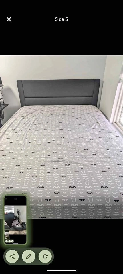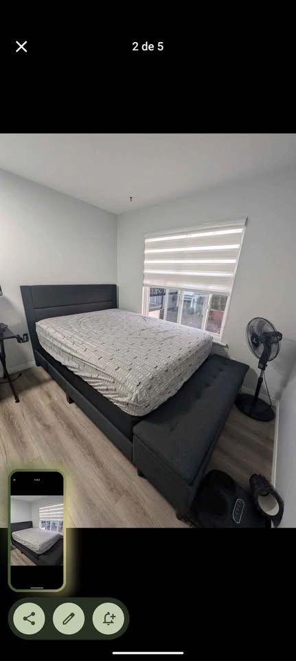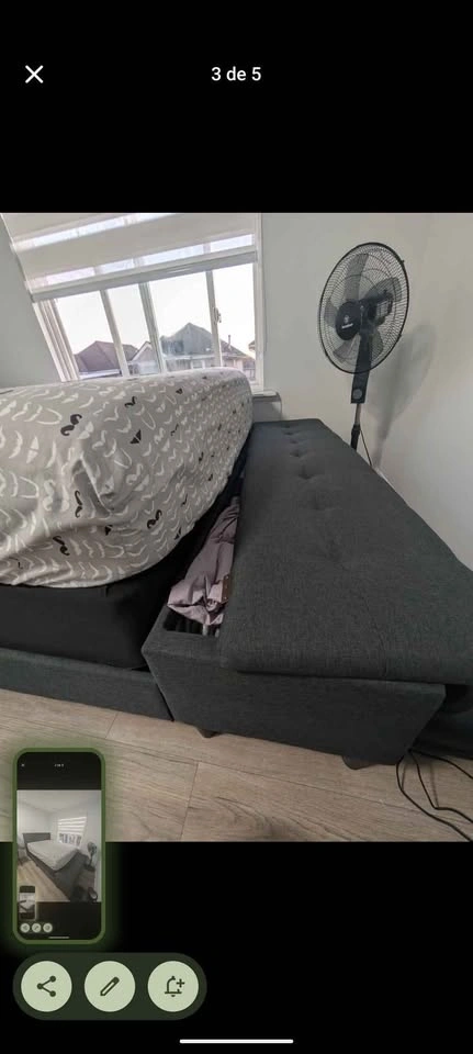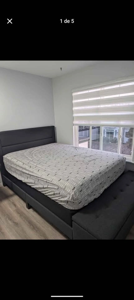 Selling a complete Queen Size Bed Set—perfect for a new apartment or spare bedroom! What's Included: Queen Size Bed Frame: Upholstered in a modern dark grey/charcoal fabric with a stylish, slightly angled headboard. Built-in Storage Bench/Ottoman: A huge bonus! The footboard is a large, upholstered storage bench with a hinged top (as seen in the photos) which is perfect for stowing extra blankets, pillows, or clothes to keep your room tidy. It features subtle tufting on top. Queen Size Mattress: Included with the bed frame. Key Details: Size: Queen Color: Dark Grey/Charcoal Condition: Good, well-maintained condition. Ready for its new home. Price: $300 This bed offers great functionality and storage without taking up extra floor space. It's a fantastic deal for both a sturdy frame and mattress! Pick up only. In Surrey.