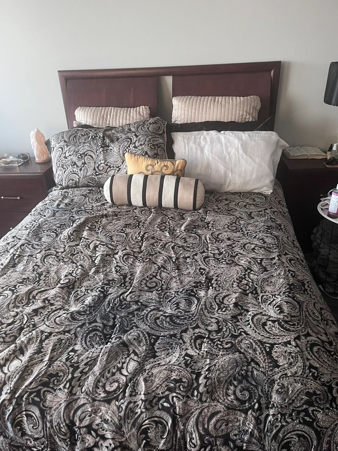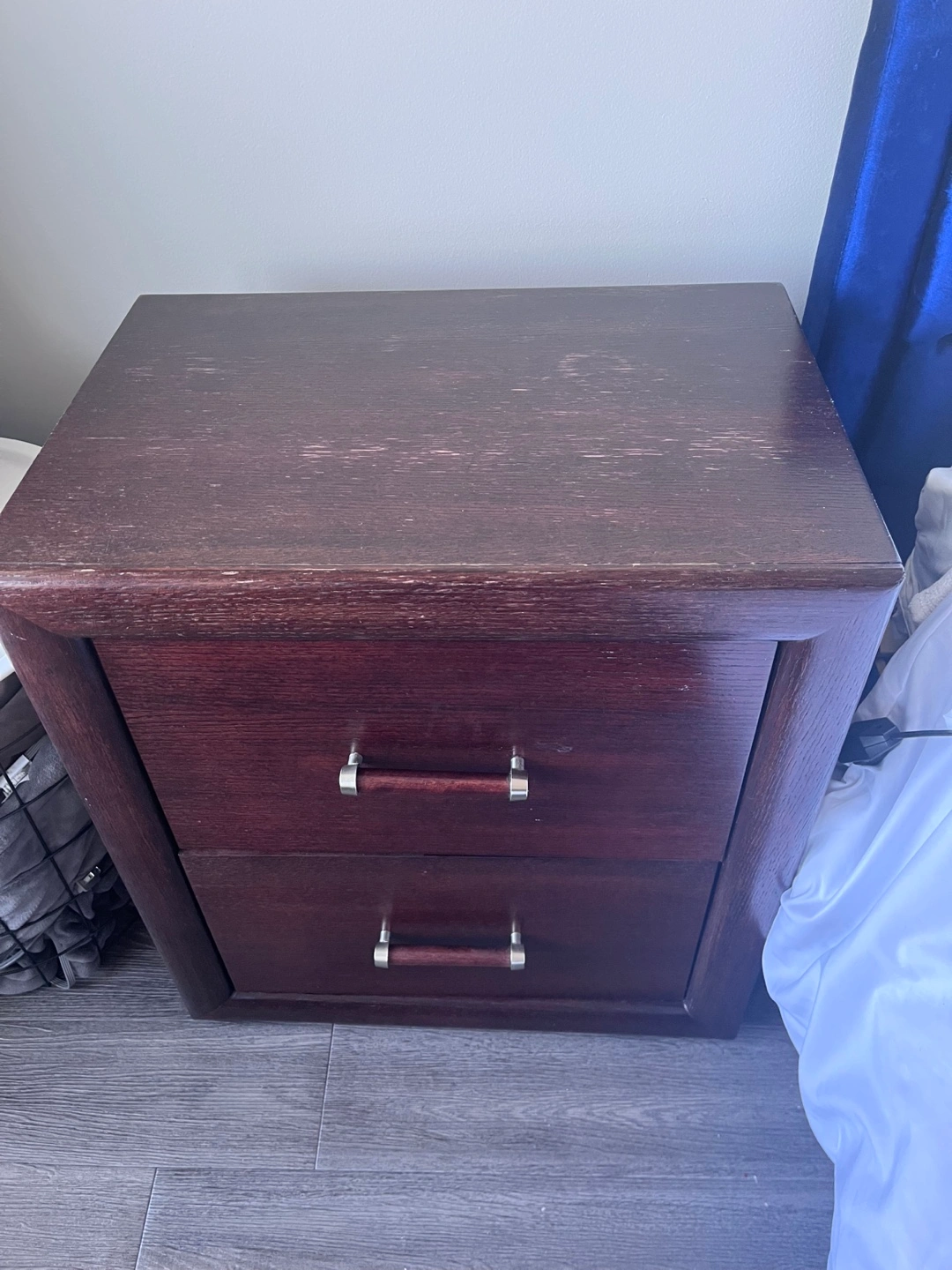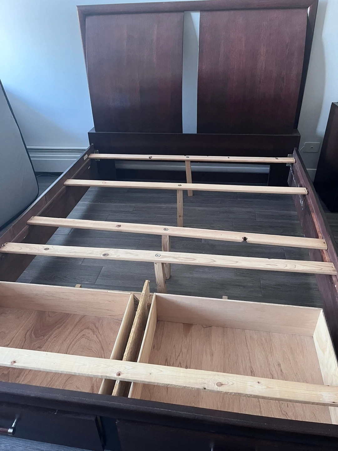 Dark brown queen-size bed frame. Features two storage drawers. Some minor damage to one headboard section, shown in photos. Solid wood construction. Includes headboard and footboard 2 side tables. Mattress not included