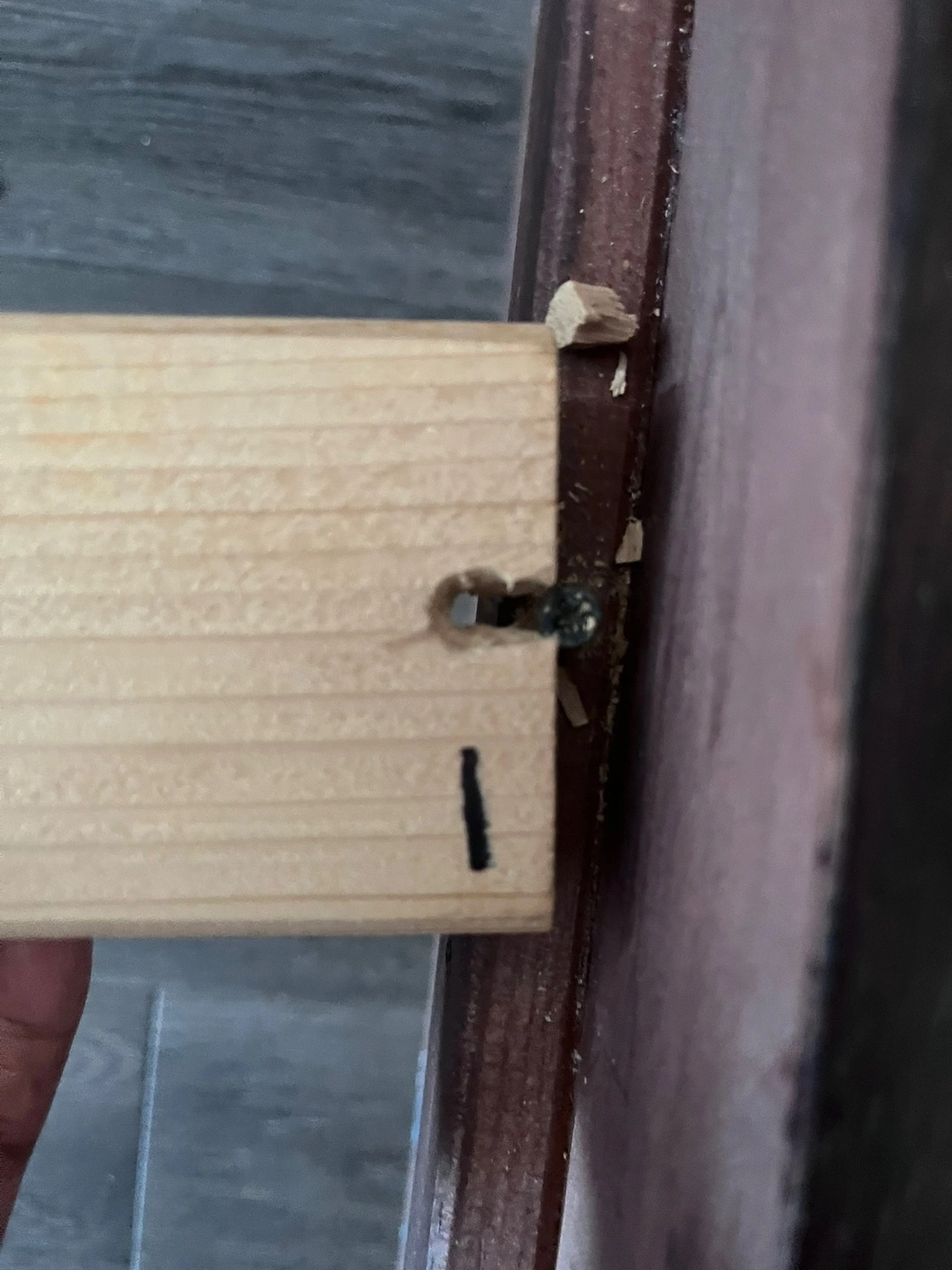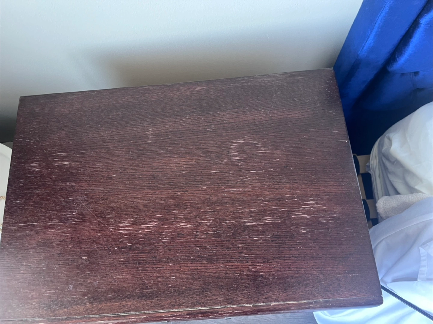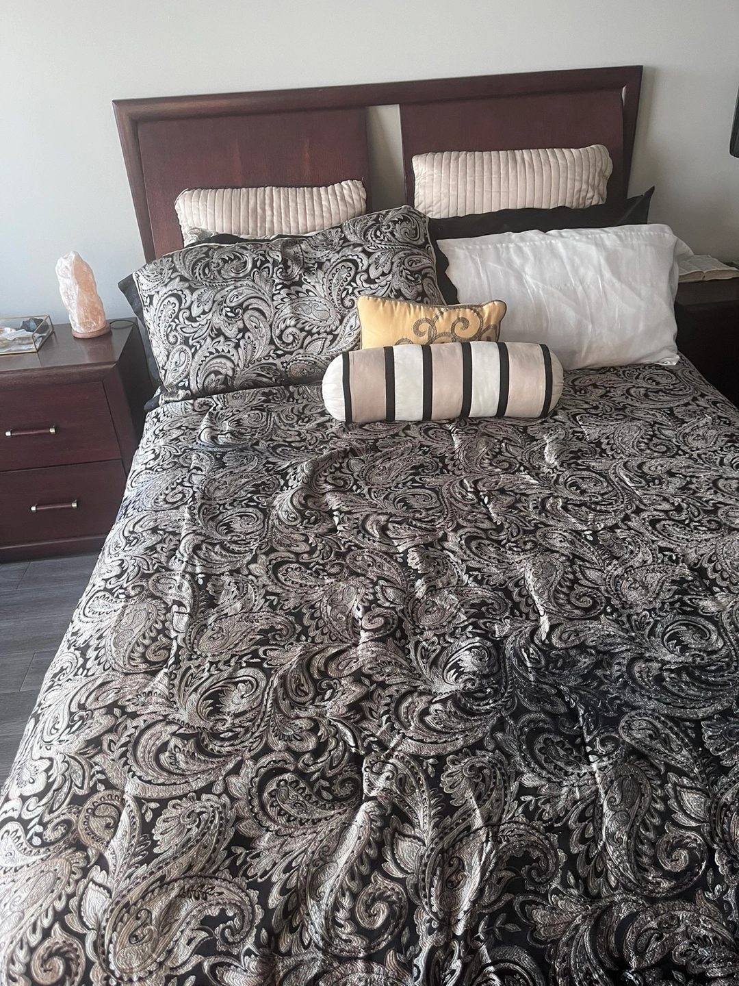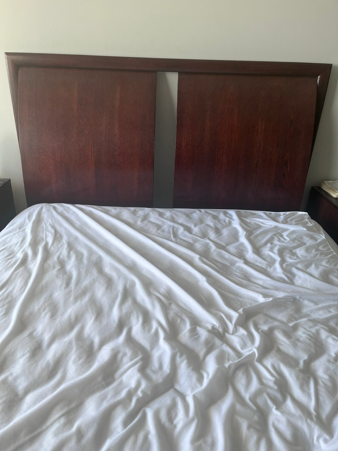 Dark brown queen-size bed frame. Features two storage drawers. Some minor damage to one headboard section, shown in photos. Solid wood construction. Includes headboard and footboard 2 side tables. Mattress not included