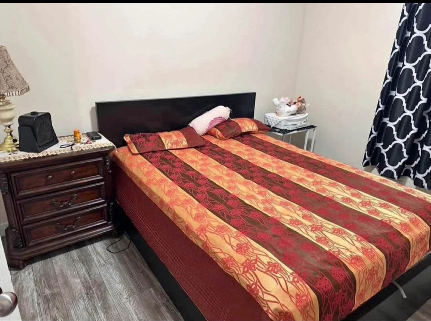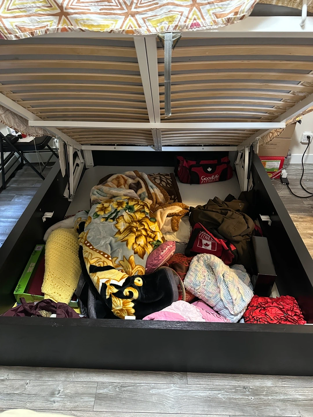 Selling a queen-size bed frame with built-in storage underneath! It's great for maximizing space and keeping things organized. The bed frame is in good condition and ready for a new home. Perfect for adding functionality and style to your bedroom