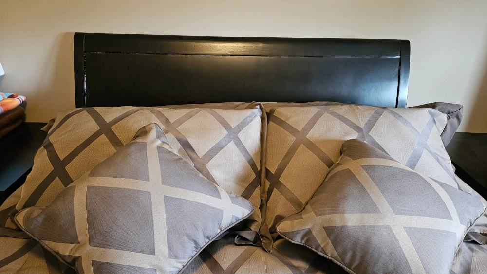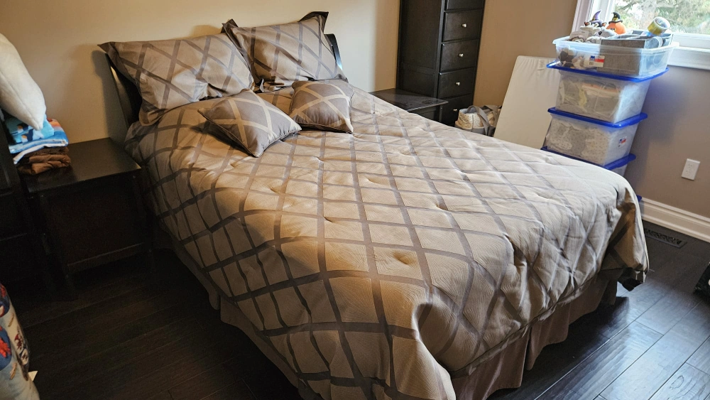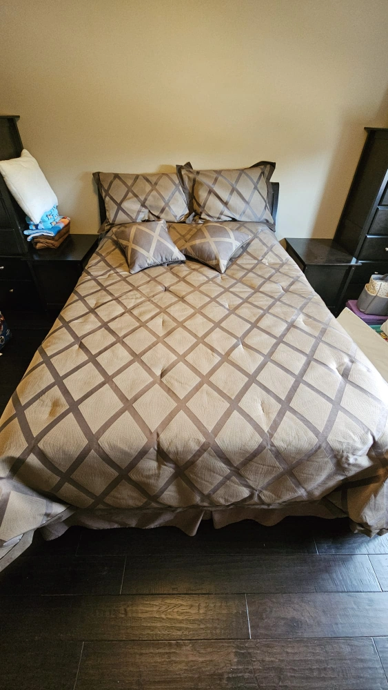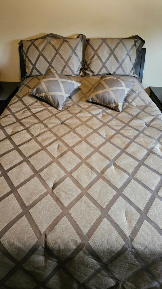 Selling a queen size bedding set in a neutral brown and beige colour scheme. It includes the comforter, two pillow shams (pillows not included, only shams), and two decorative pillows. This set will add a touch of elegance to your bedroom!