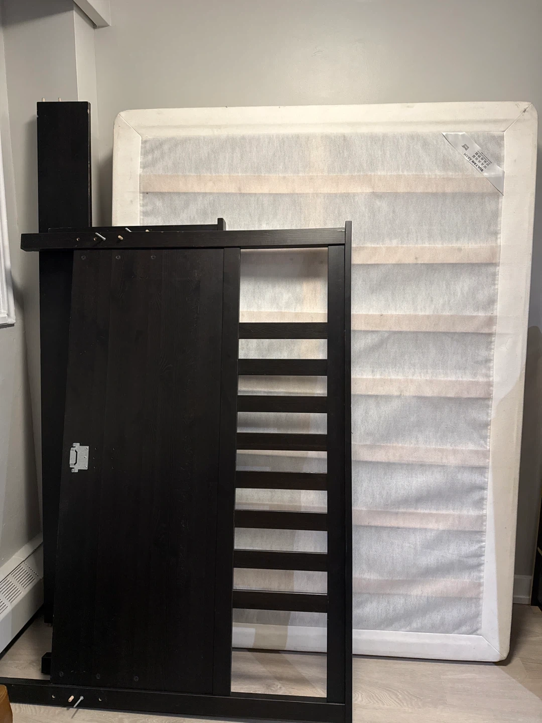 10Selling a bed frame with a dark wood finish. It comes with a bed box. The bed frame is in good condition and ready for a new home! Selling bedframe and bed box together for $50 OBO. Dissembled for easy moving.