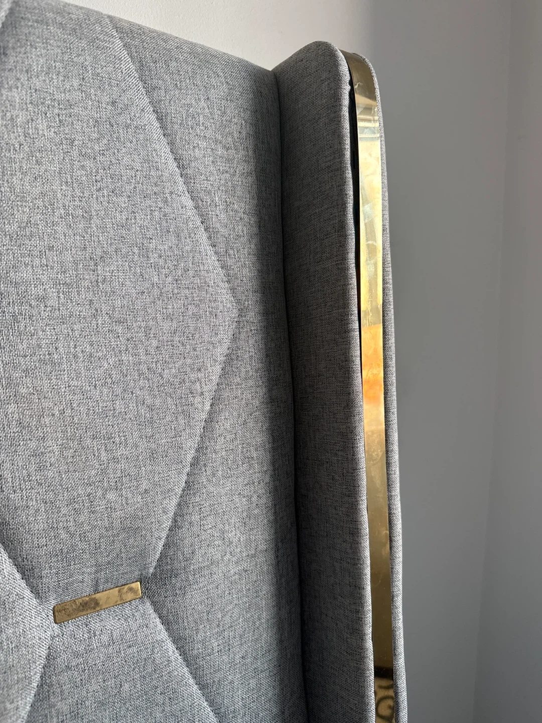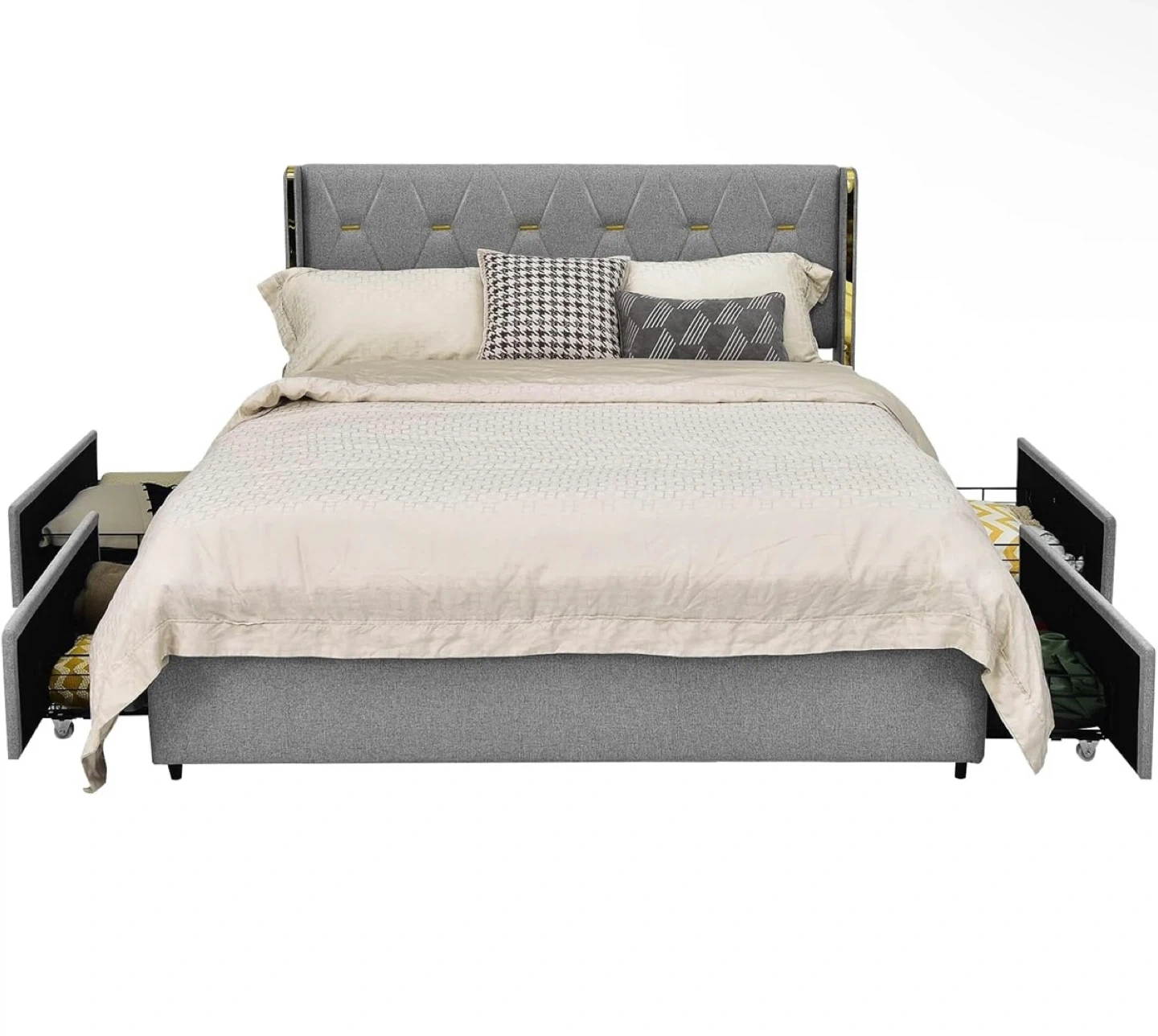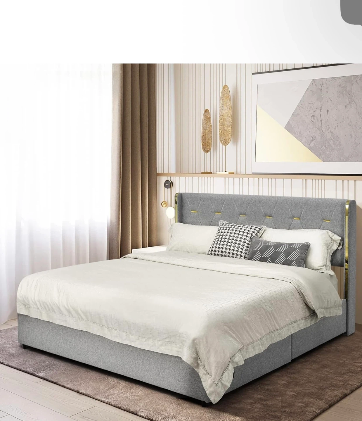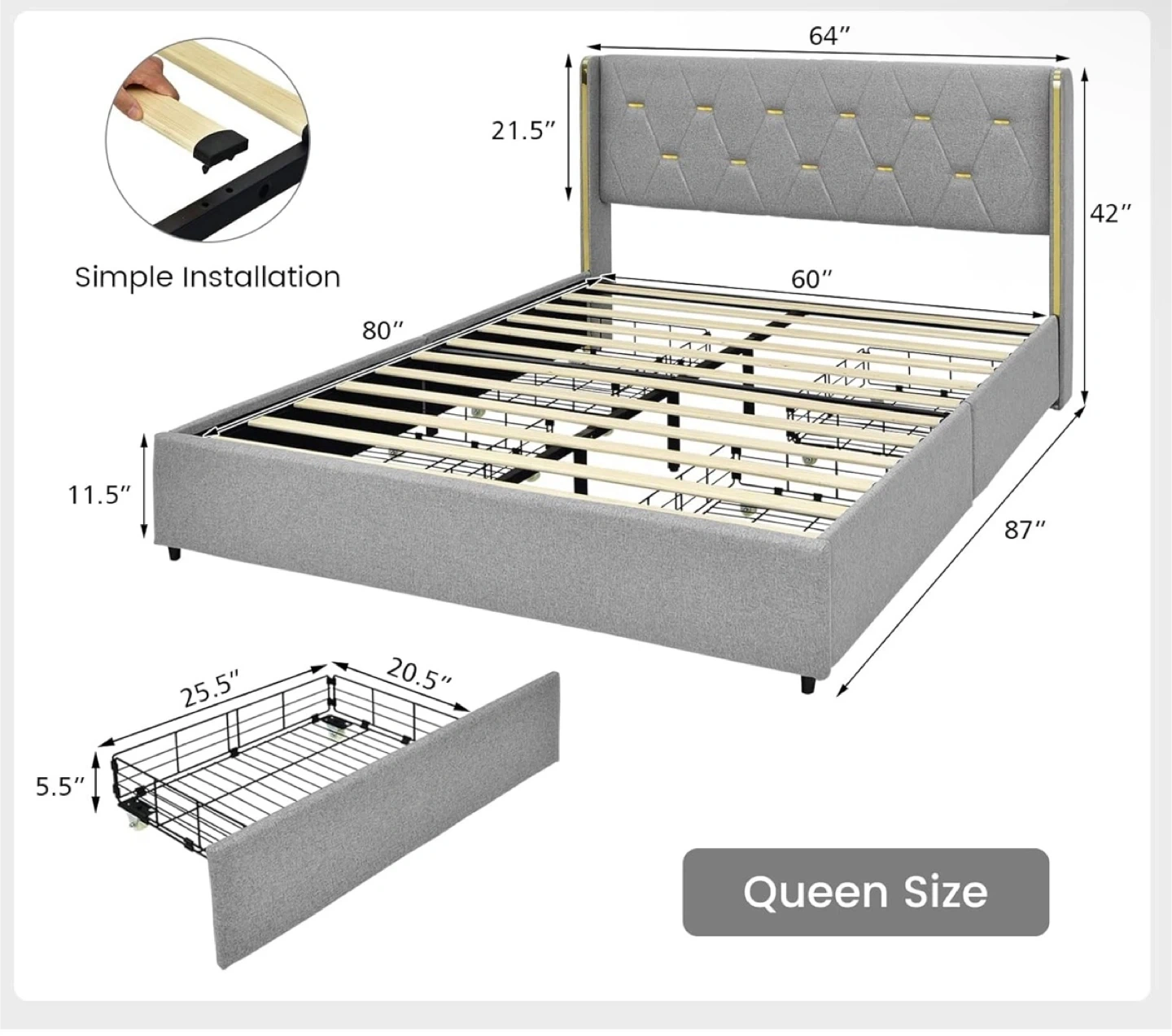 Selling a queen-size upholstered bed frame in a light grey colour. The headboard has a diamond pattern with gold accents. It also features convenient storage drawers on both sides. *** queen memory foam mattress also available for additional $50, both are 2 years old*** The dimensions are: - Headboard height: 42" - Bed width: 64" - Bed length: 87" - Drawer height: 25.5" - Drawer width: 20.5" - Drawer depth: 5.5"