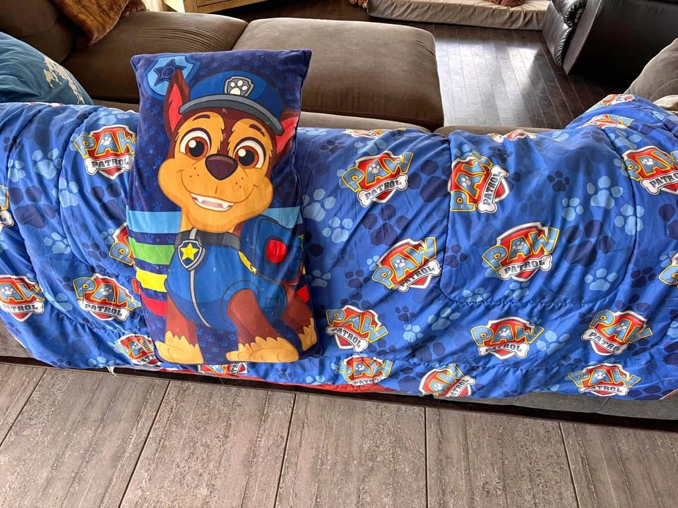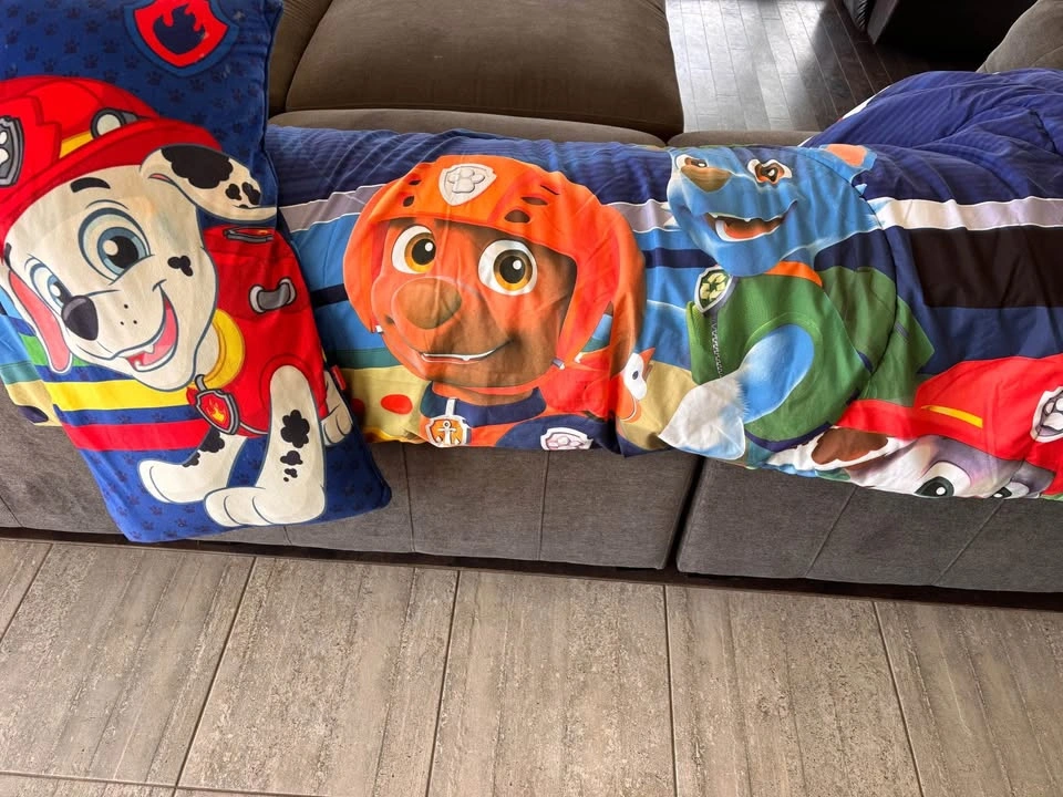 Queen size Paw Patrol comforter and matching body pillow, but also worked well on my son’s twin bed. Pictures show both sides as they have different characters. Smoke free home, cross posted and located 3 minutes from Drayton.