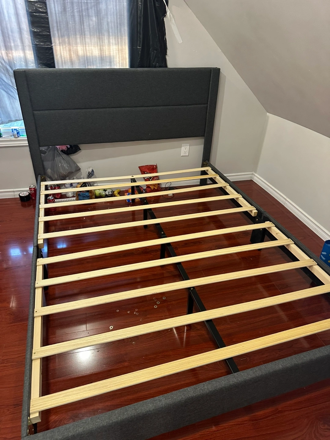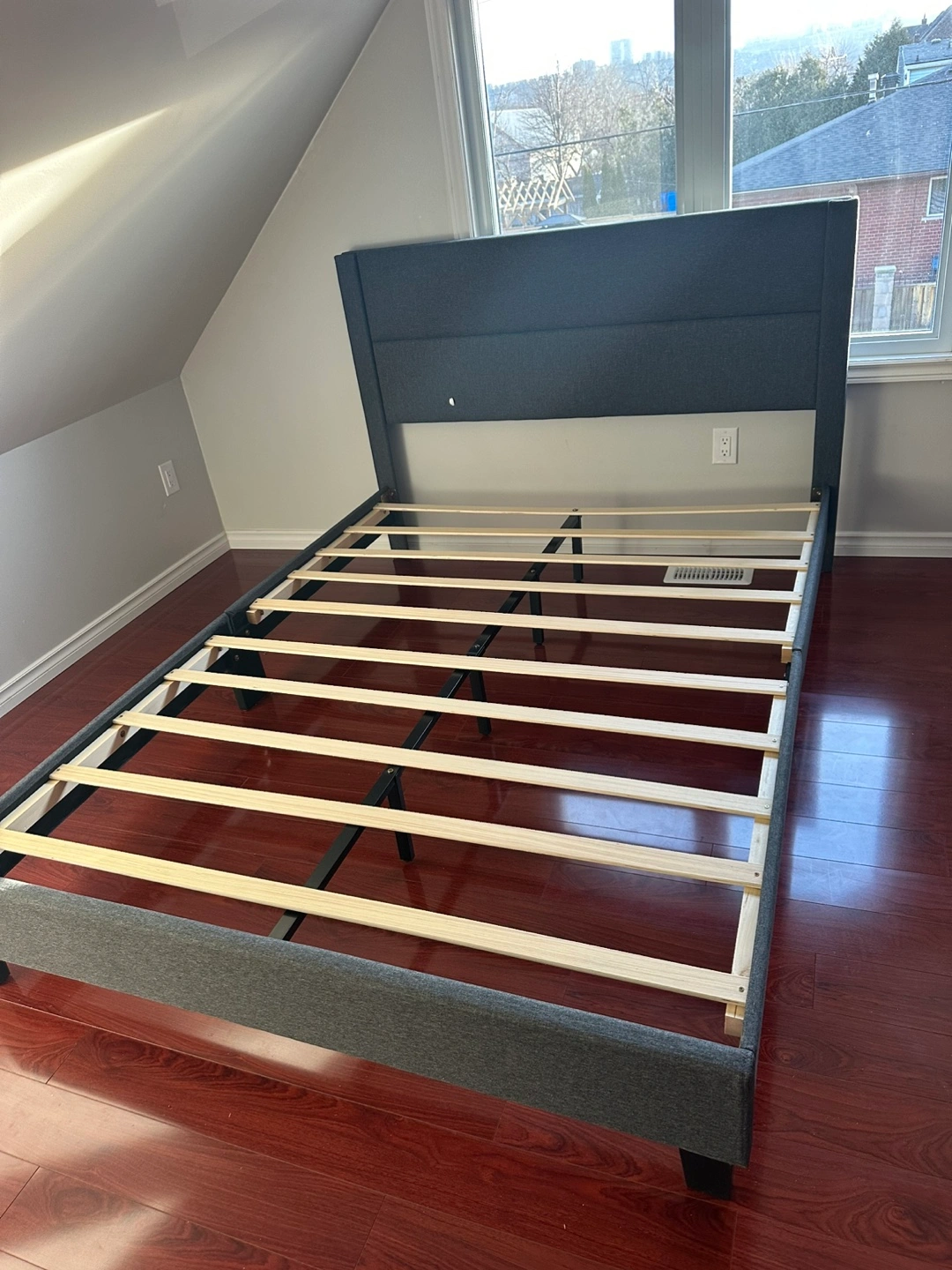 21Grey fabric headboard and frame. Wooden slats included. Queen size. Minimal assembly required.