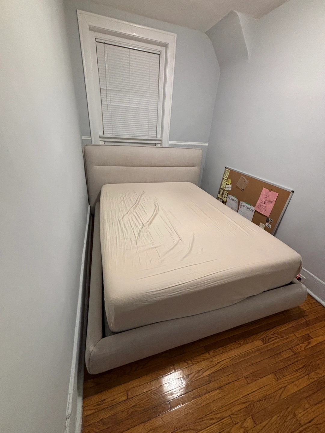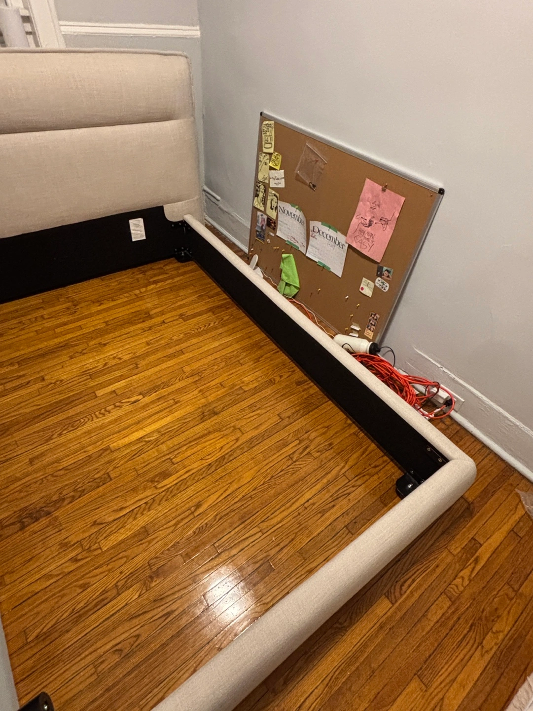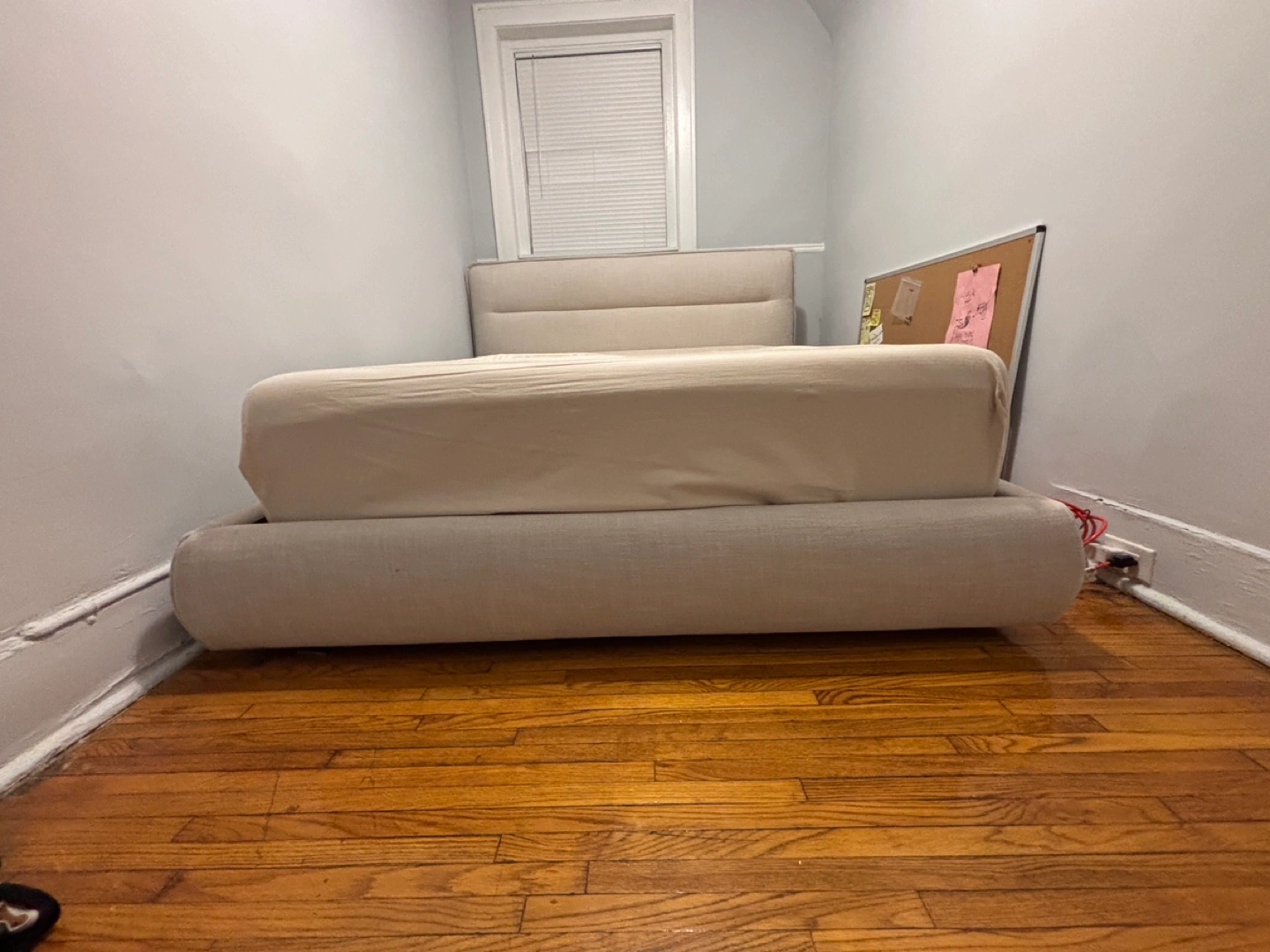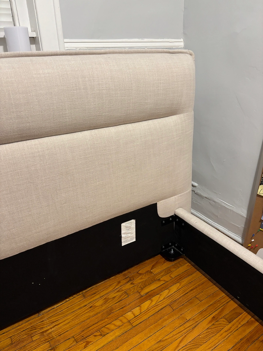 10Beige fabric bed frame. Queen size. Minimalist style. Includes headboard and footboard. BED FRAME ONLY. No slats or mattress base - will need own boxspring or similar. Size: 90”-91” approx total length 45” Headboard height 12” - base and sides height New: $1519.00 (Mobilia) Selling: $300 (moving sale, need it gone!)