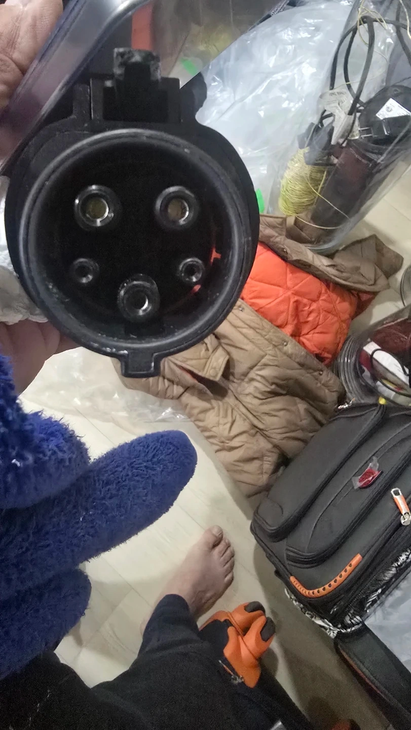 This is an adapter for electric vehicle charging. It comes with protective packaging inserts. It's black and appears to be made of durable plastic.
