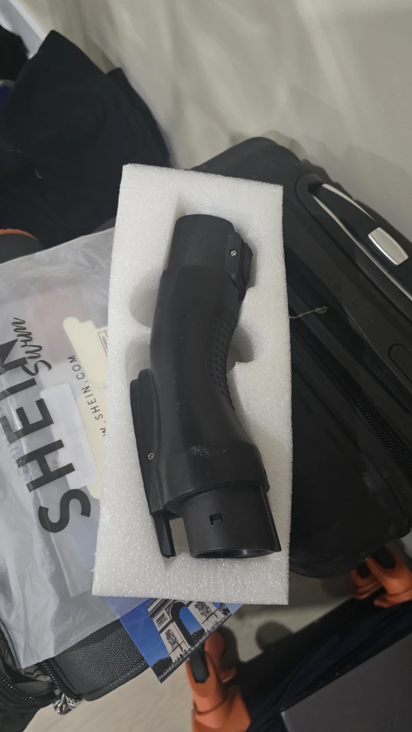 This is an adapter for electric vehicle charging. It comes with protective packaging inserts. It's black and appears to be made of durable plastic.