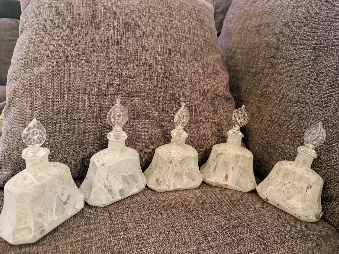 Five delicate Creazioni Silvestri empty perfume bottles made of Arte Murano Crystal.