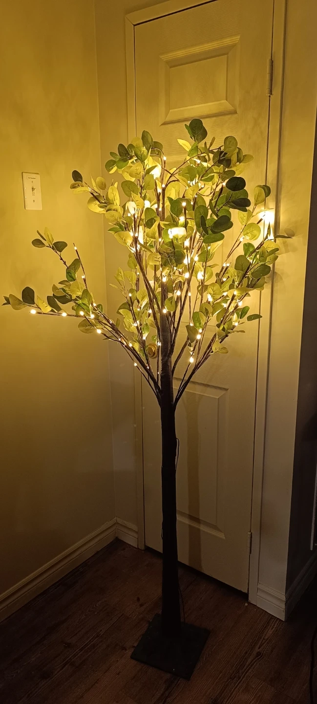 This decorative artificial eucalyptus tree has green leaves and is lit with LED lights. It has a brown trunk and stands on a black square base. Perfect for adding a cozy ambiance to any room!