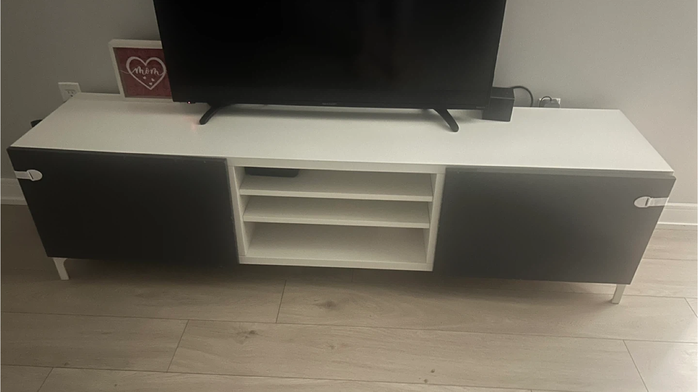 Selling a TV stand with a white top and shelves, and black doors. It has a clean, modern look with ample storage space. Perfect for any living room!