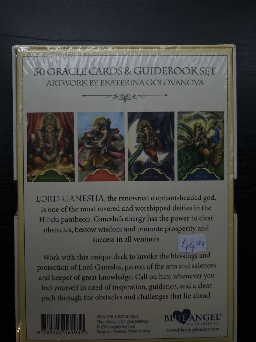 50 oracle cards and guidebook. Artwork by Ekaterina Golovanova. New and sealed. Features Lord Ganesha. Invoke blessings and protection. Guidance and a clear path through obstacles and challenges.