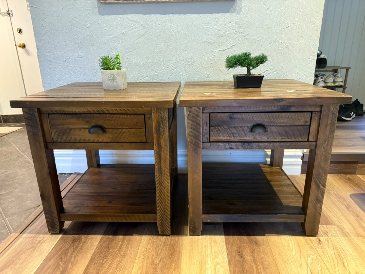 A pair of nightstands made from real wood. They have minor marks from use but are very sturdy and durable.