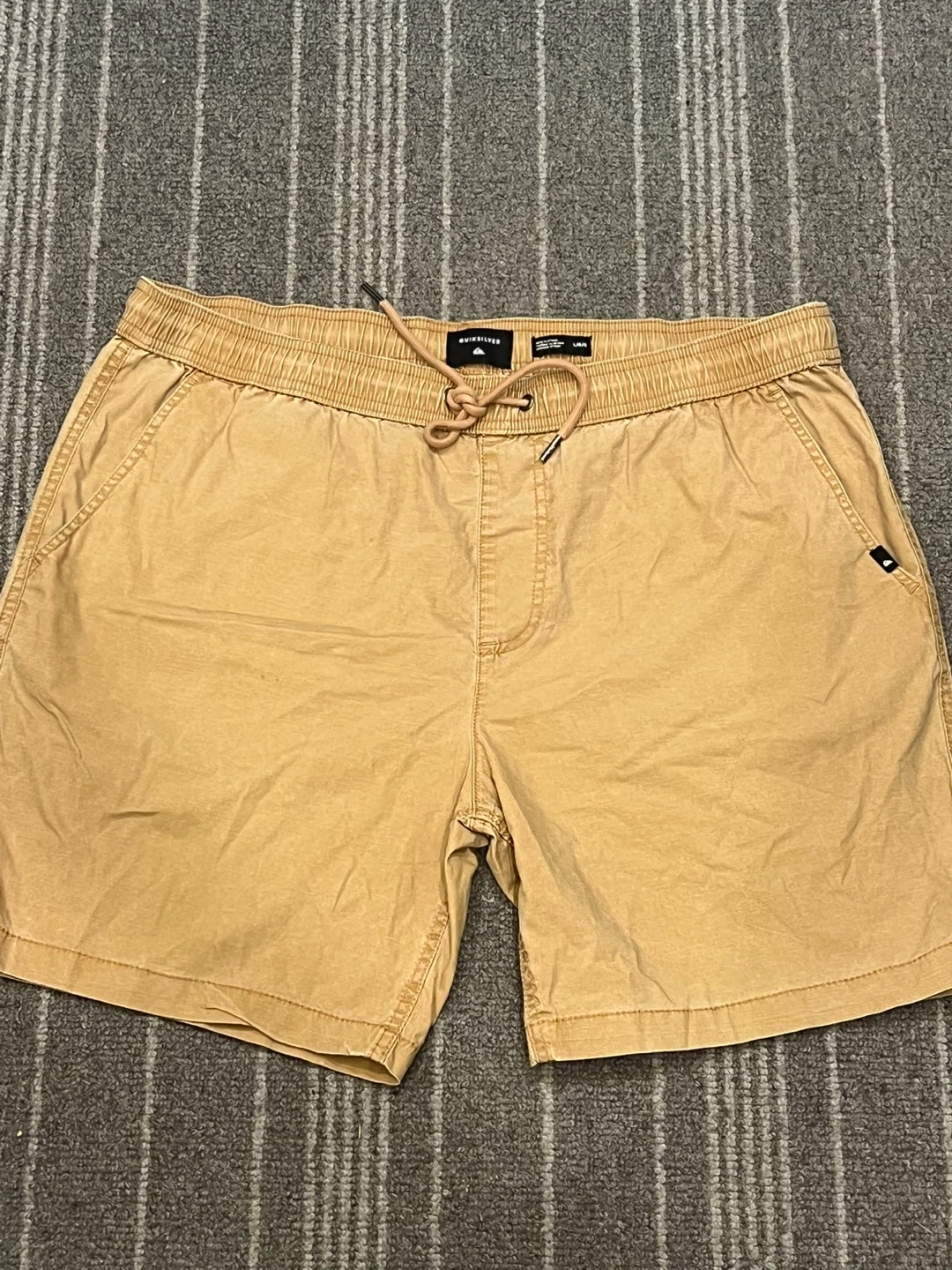 10These Quiksilver shorts are a size L/G and come in a tan colour. They feature a comfortable elastic waistband with a drawstring. Perfect for casual wear!