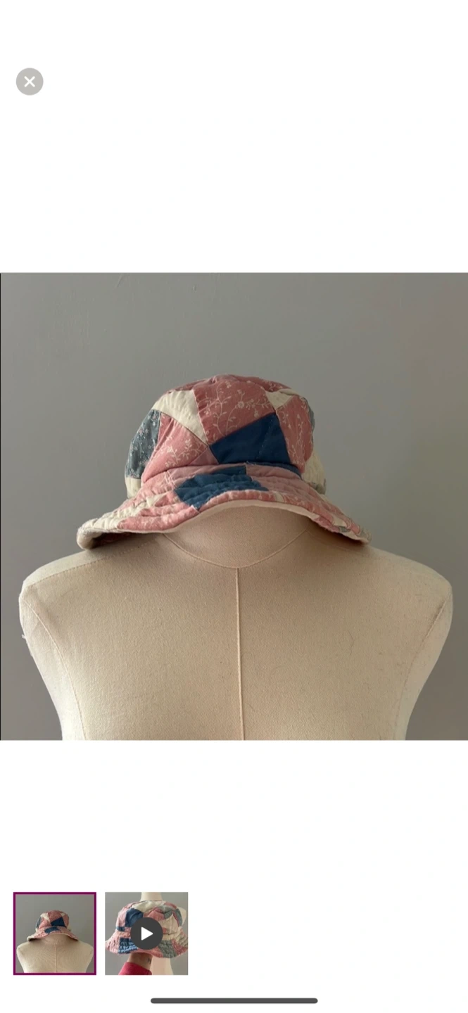 173Selling a handmade quilted bucket hat. It features a unique patchwork design with pink, white, and blue floral patterns. Perfect for adding a touch of whimsy to your wardrobe! Never worn. Like new.