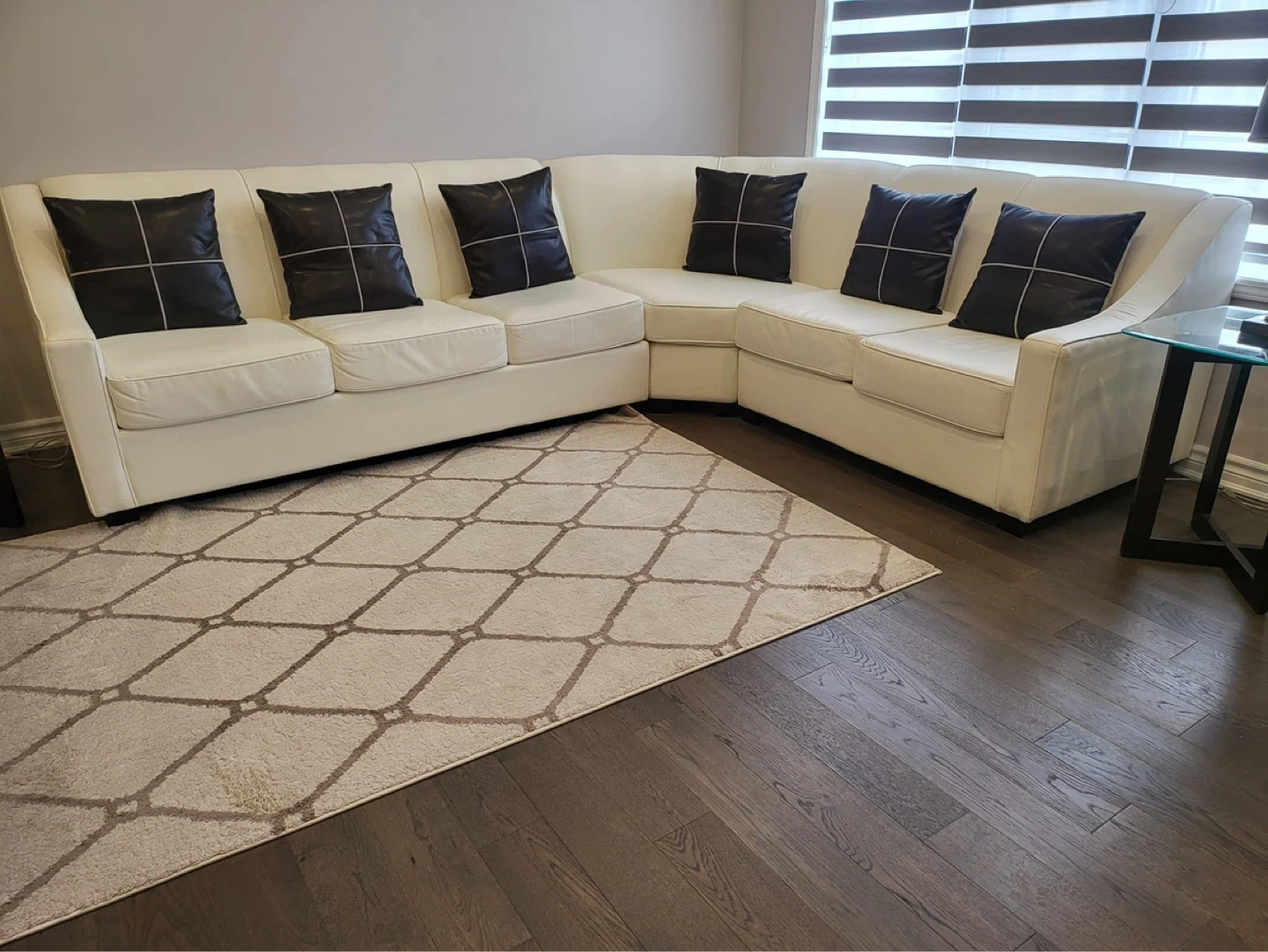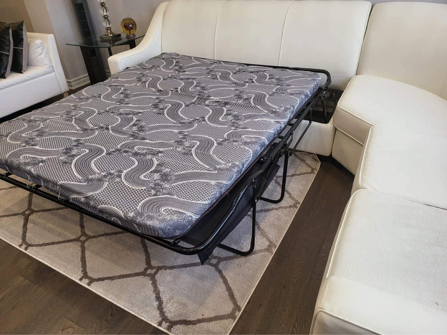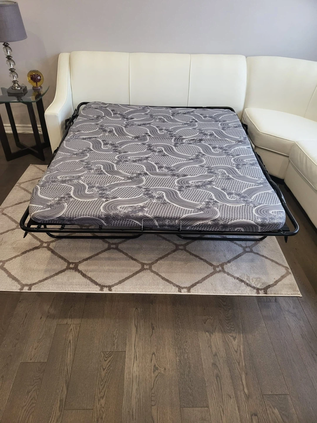 Custom built Cream white leather sectional sofa that converts into a pull-out bed with mattress. It includes accent pillows and sits on wooden legs. This sofa is perfect for accommodating overnight guests.