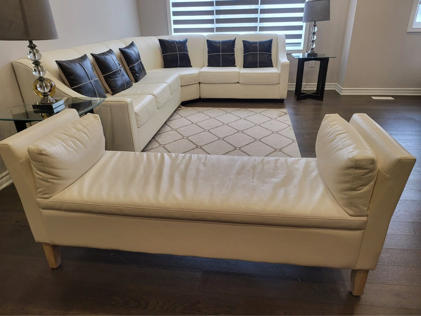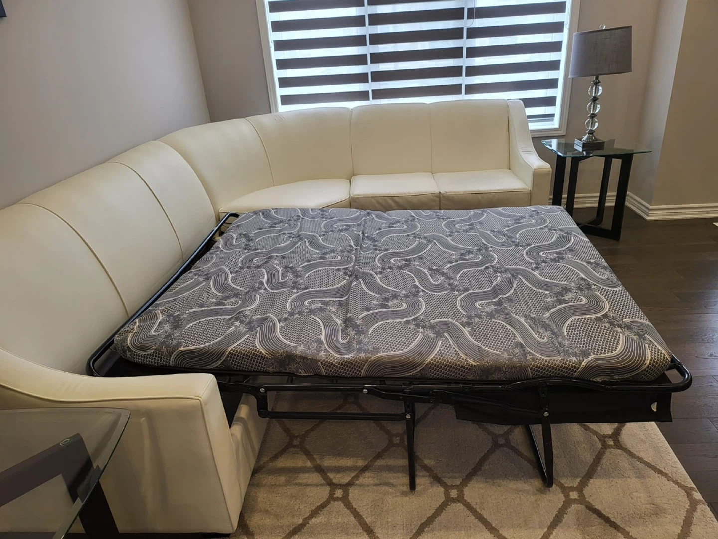 Custom built Cream white leather sectional sofa that converts into a pull-out bed with mattress. It includes accent pillows and sits on wooden legs. This sofa is perfect for accommodating overnight guests.