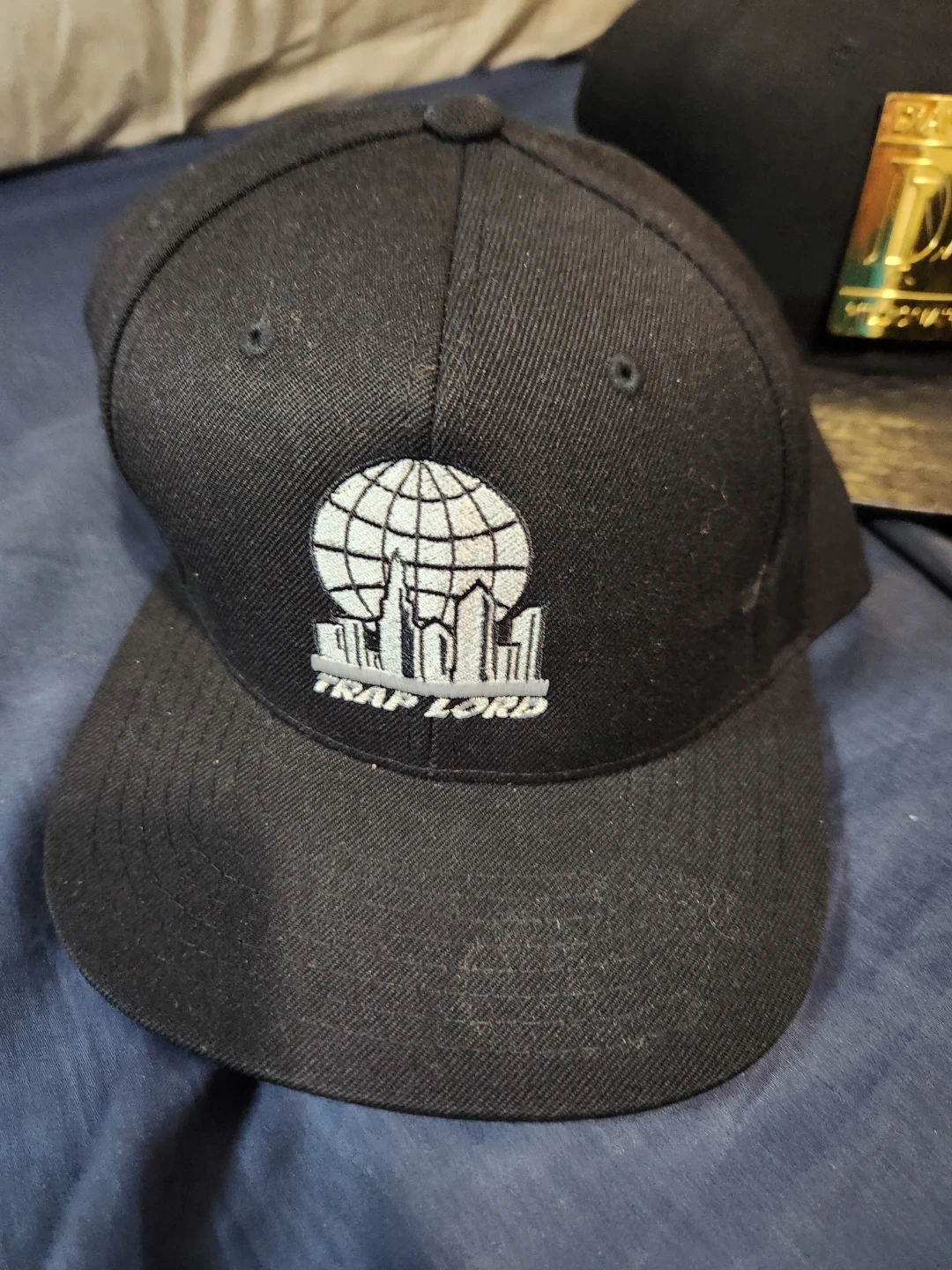 This is a black Trap Lord baseball cap. It features an embroidered globe and city skyline design on the front. The cap has a flat brim and is adjustable. $35 for all hats all.are brand new