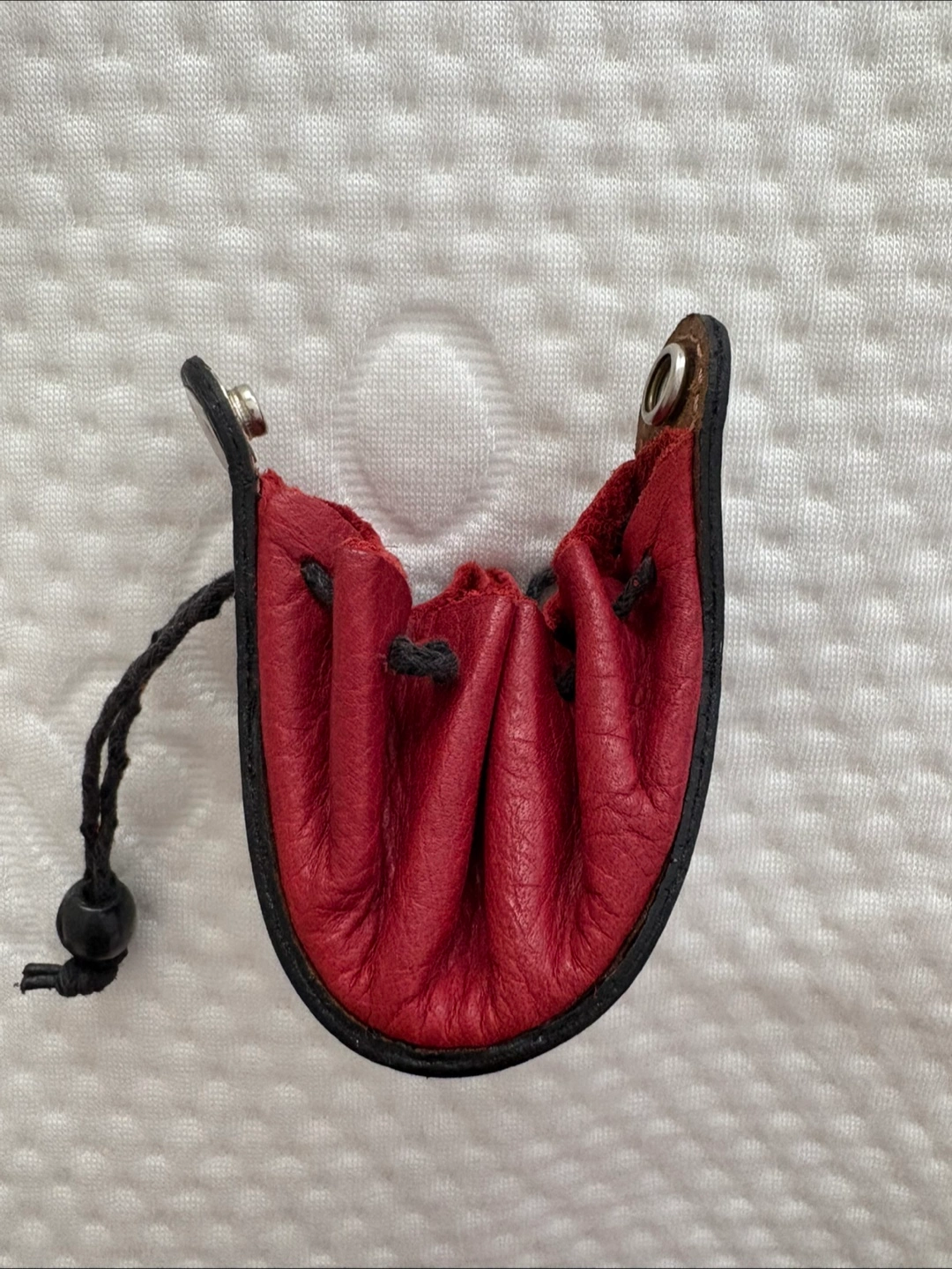 A cute little leather coin pouch! It's red and black and in great condition. Perfect for keeping your change organized.