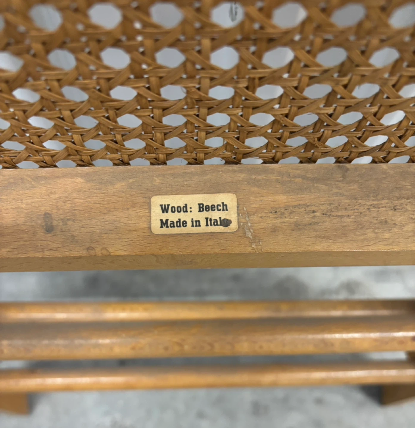 This is a beech wooden folding chair, made in Italy, featuring a woven cane seat. It's a versatile piece that can be easily stored away. Chair folds for convenient storage.