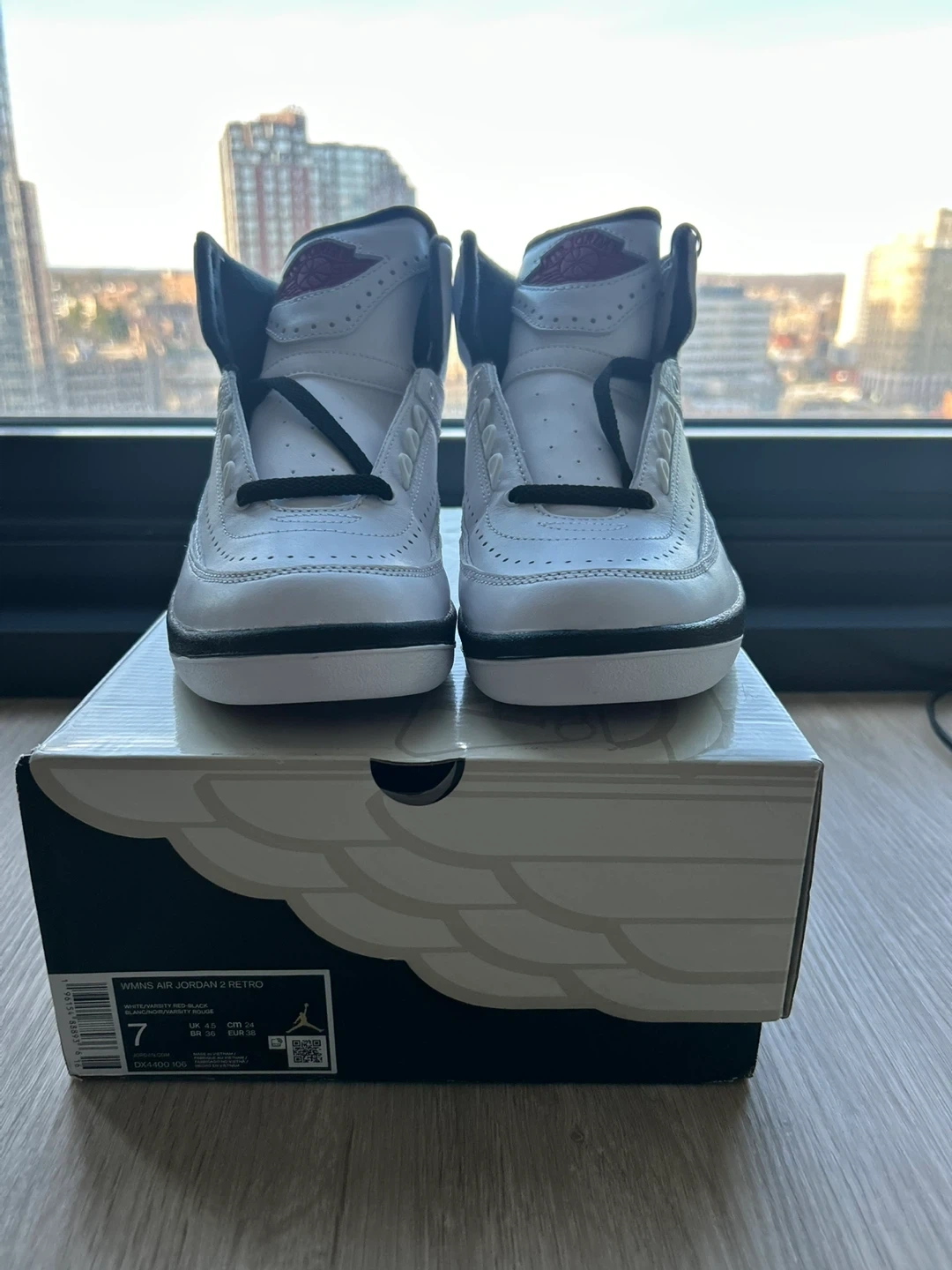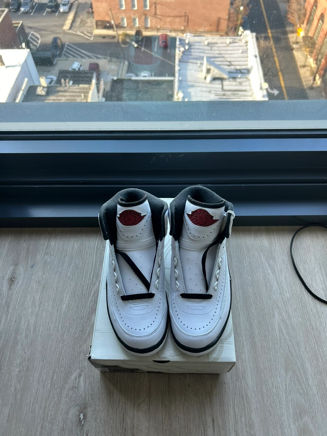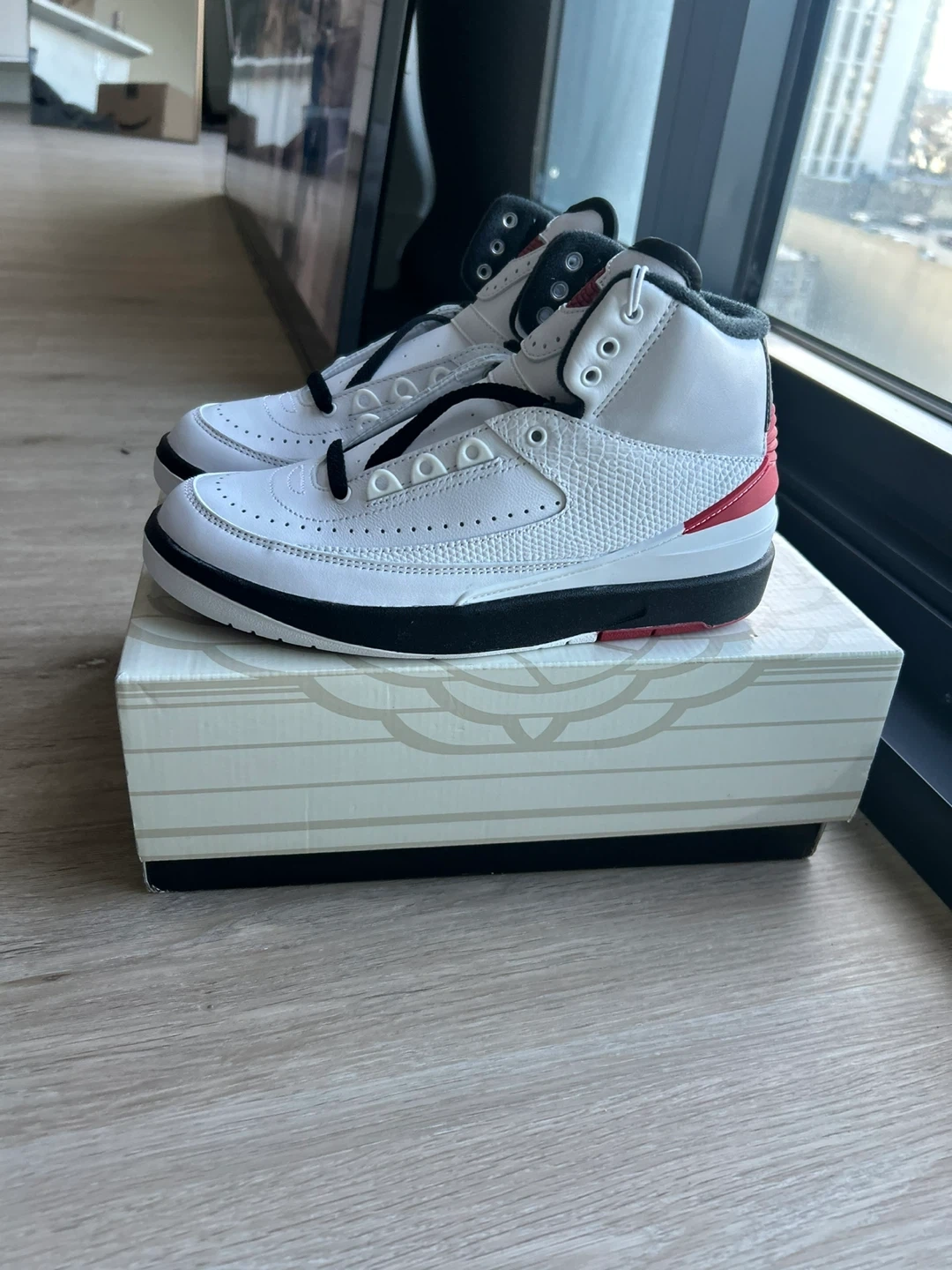 Selling a pair of Air Jordan 2 Retro sneakers in the classic white and varsity red colorway. These high-tops feature a sleek design with black laces and a comfortable fit. Perfect for basketball enthusiasts or anyone looking to add a stylish touch to their footwear collection!