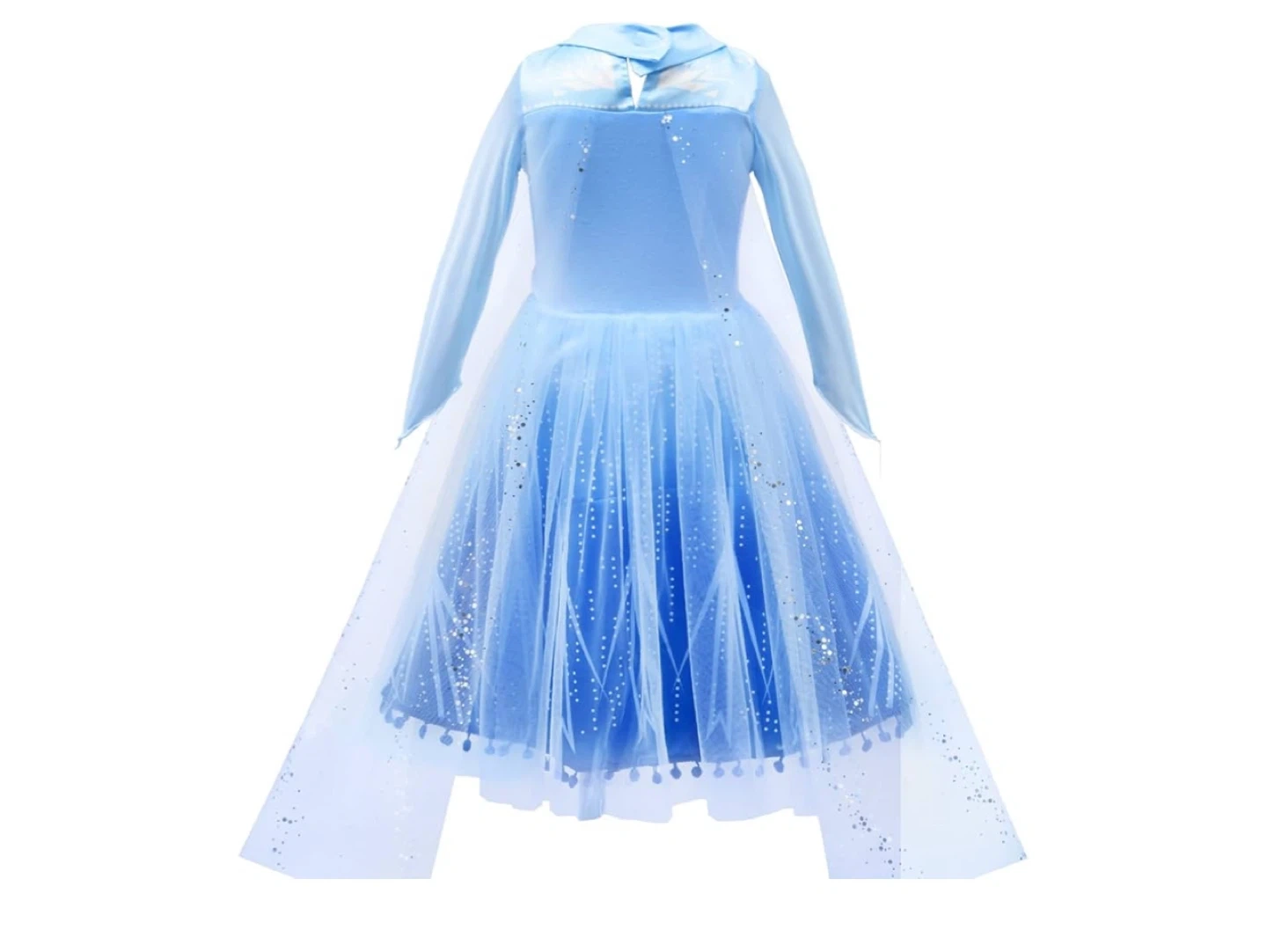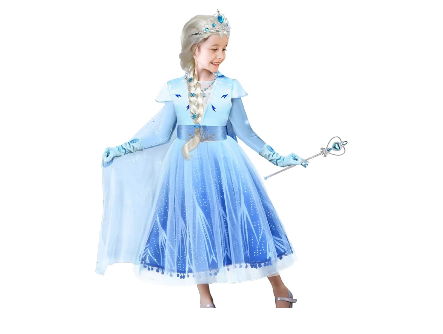 A beautiful blue Elsa-inspired dress, perfect for dress-up or parties. It includes a tiara, wand, necklace, bracelet, gloves, and a wig. Size 100 (2-3 Years).